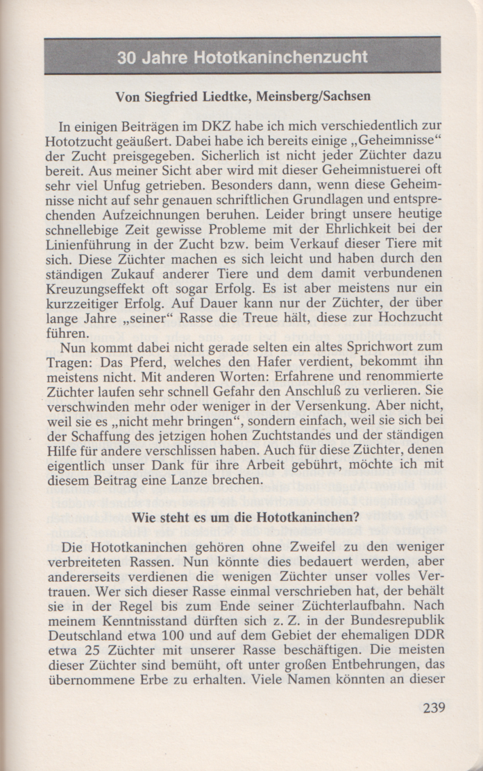 Die Hototkaninchen gehören ohne Zweifel zu den weniger verbreiteten Rassen. Nun könnte dies bedauert werden, aber andererseits verdienen die wenigen Züchter unser volles Vertrauen. Wer sich dieser Rasse einmal verschrieben hat, der behält sie in der Regel bis zum Ende seiner Züchterlaufbahn. Nach meinem Kenntnisstand dürften sich z. Z. in der Bundesrepublik Deutschland etwa 100 und auf dem Gebiet der ehemaligen DDR etwa 25 Züchter mit unserer Rasse beschäftigen. Die meisten dieser Züchter sind bemüht, oft unter großen Entbehrungen, das übernommene Erbe zu erhalten. Viele Namen könnten an dieser Stelle genannt werden. Ich will mich aber damit begnügen, allen Freunden, die bei der Stange geblieben sind und bleiben, herzlich zu danken.
