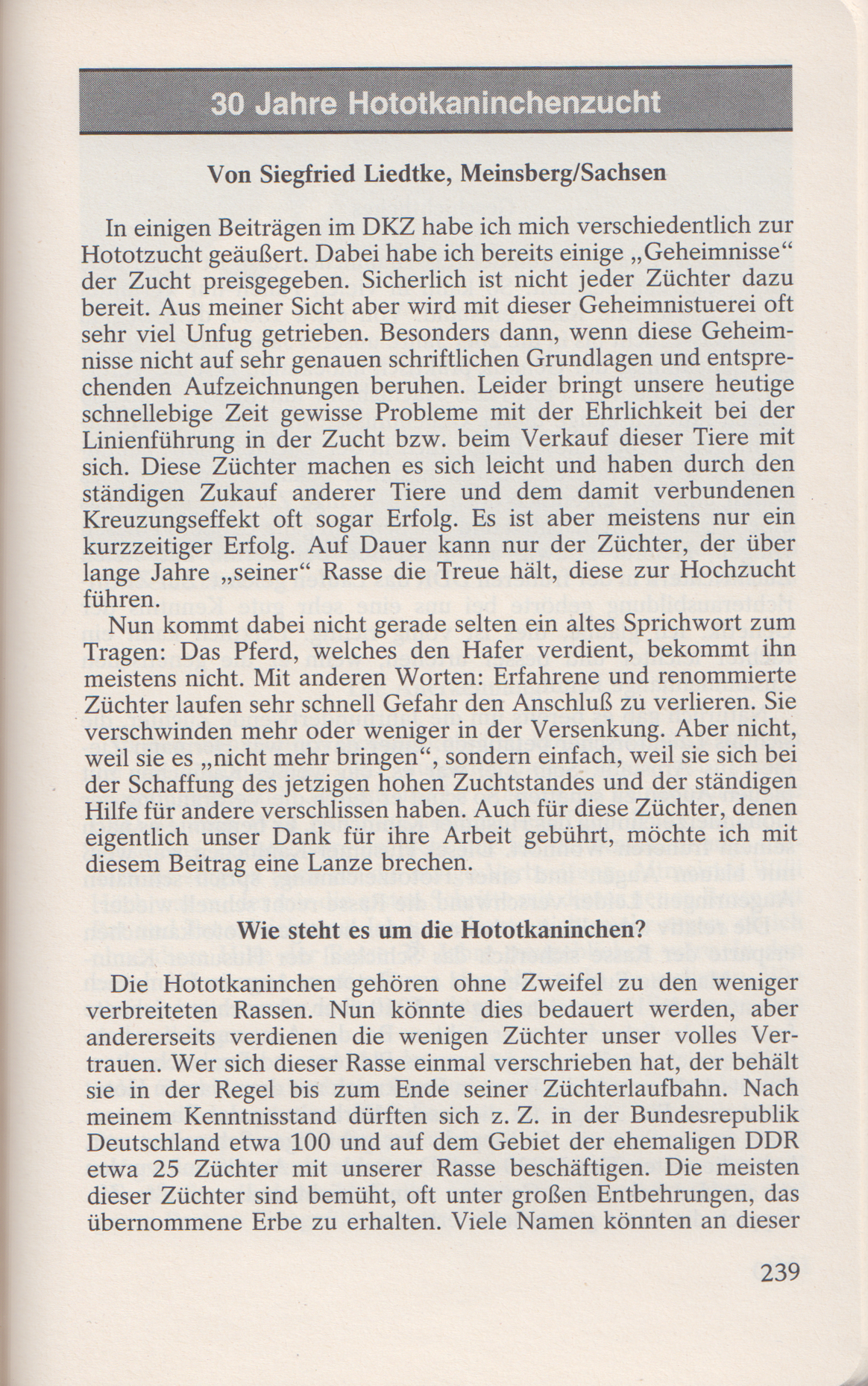 Die Hototkaninchen gehören ohne Zweifel zu den weniger verbreiteten Rassen. Nun könnte dies bedauert werden, aber andererseits verdienen die wenigen Züchter unser volles Vertrauen. Wer sich dieser Rasse einmal verschrieben hat, der behält sie in der Regel bis zum Ende seiner Züchterlaufbahn. Nach meinem Kenntnisstand dürften sich z. Z. in der Bundesrepublik Deutschland etwa 100 und auf dem Gebiet der ehemaligen DDR etwa 25 Züchter mit unserer Rasse beschäftigen. Die meisten dieser Züchter sind bemüht, oft unter großen Entbehrungen, das übernommene Erbe zu erhalten. Viele Namen könnten an dieser Stelle genannt werden. Ich will mich aber damit begnügen, allen Freunden, die bei der Stange geblieben sind und bleiben, herzlich zu danken.