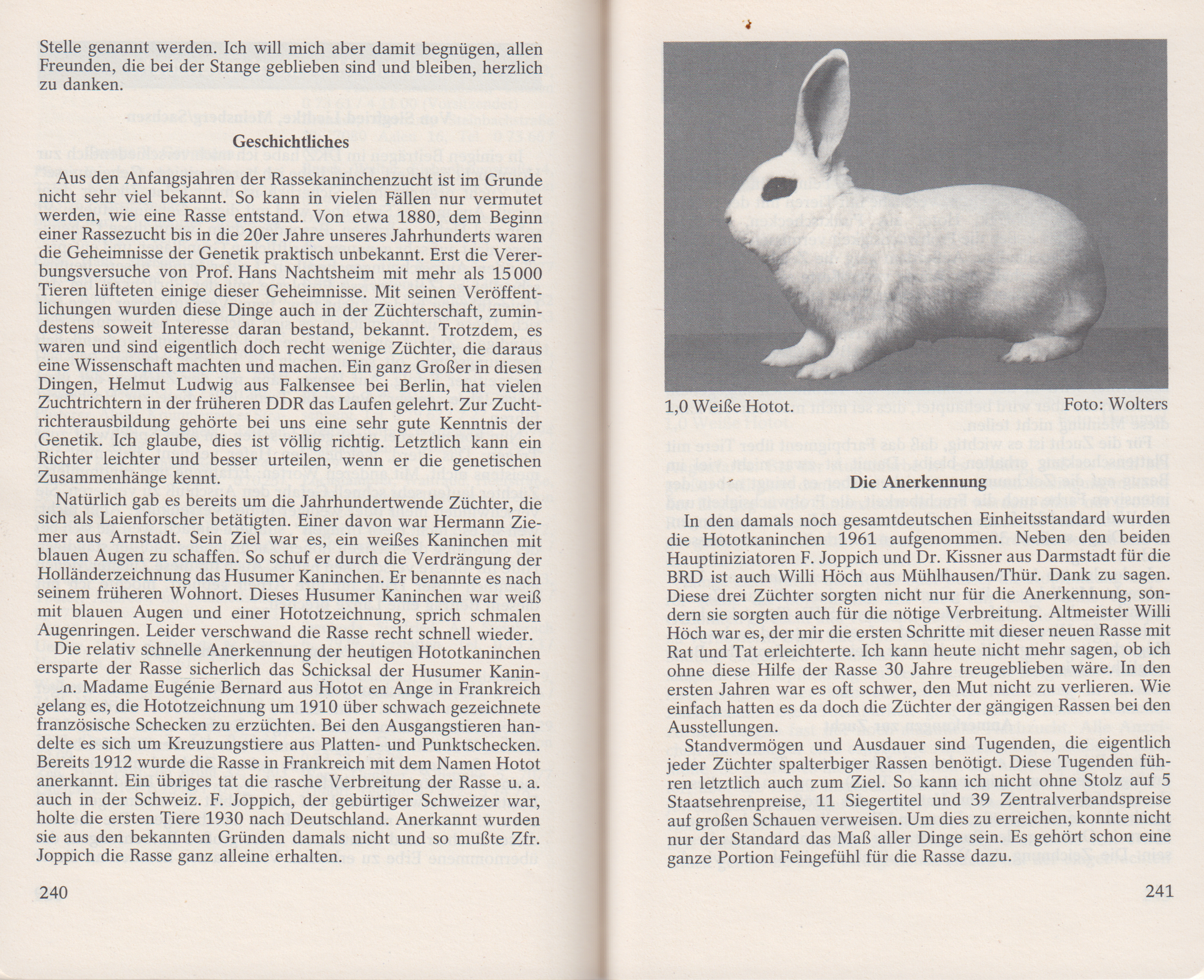 In den damals noch gesamtdeutschen Einheitsstandard wurden die Hototkaninchen 1961 aufgenommen. Neben den beiden Hauptinitiatoren F. Joppich und Dr. Kissner aus Darmstadt für die BRD ist auch Willi Höch aus Mühlhausen/Thür. Dank zu sagen. Diese drei Züchter sorgten nicht nur für die Anerkennung, sondern sie sorgten auch für die nötige Verbreitung. Altmeister Willi Höch war es, der mir die ersten Schritte mit dieser neuen Rasse mit Rat und Tat erleichterte. Ich kann heute nicht mehr sagen, ob ich ohne diese Hilfe der Rasse 30 Jahre treugeblieben wäre. In den ersten Jahren war es oft schwer, den Mut nicht zu verlieren. Wie einfach hatten es da doch die Züchter der gängigen Rassen bei den Ausstellungen.