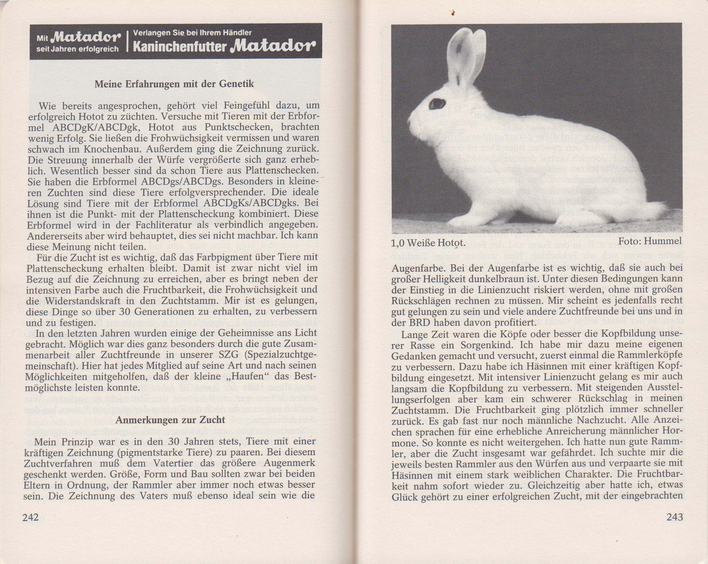 Wie bereits angesprochen, gehört viel Feingefühl dazu, um erfolgreich Hotot zu züchten. Versuche mit Tieren mit der Erbformel ABCDgK/ABCDgk, Hotot aus Punktschecken, brachten wenig Erfolg. Sie ließen die Frohwüchsigkeit vermissen und waren schwach im Knochenbau. Außerdem ging die Zeichnung zurück. Die Streuung innerhalb der Würfe vergrößerte sich ganz erheblich. Wesentlich besser sind da schon Tiere aus Plattenschecken. Sie haben die Erbformel ABCDgs/ABCDgs. Besonders in kleineren Zuchten sind diese Tiere erfolgversprechender. Die ideale Lösung sind Tiere mit der Erbformel ABCDgKs/ABCDgks. Bei ihnen ist die Punkt- mit der Plattenscheckung kombiniert. Diese Erbformel wird in der Fachliteratur als verbindlich angegeben. Andererseits aber wird behauptet, dies sei nicht machbar. Ich kann diese Meinung nicht teilen.