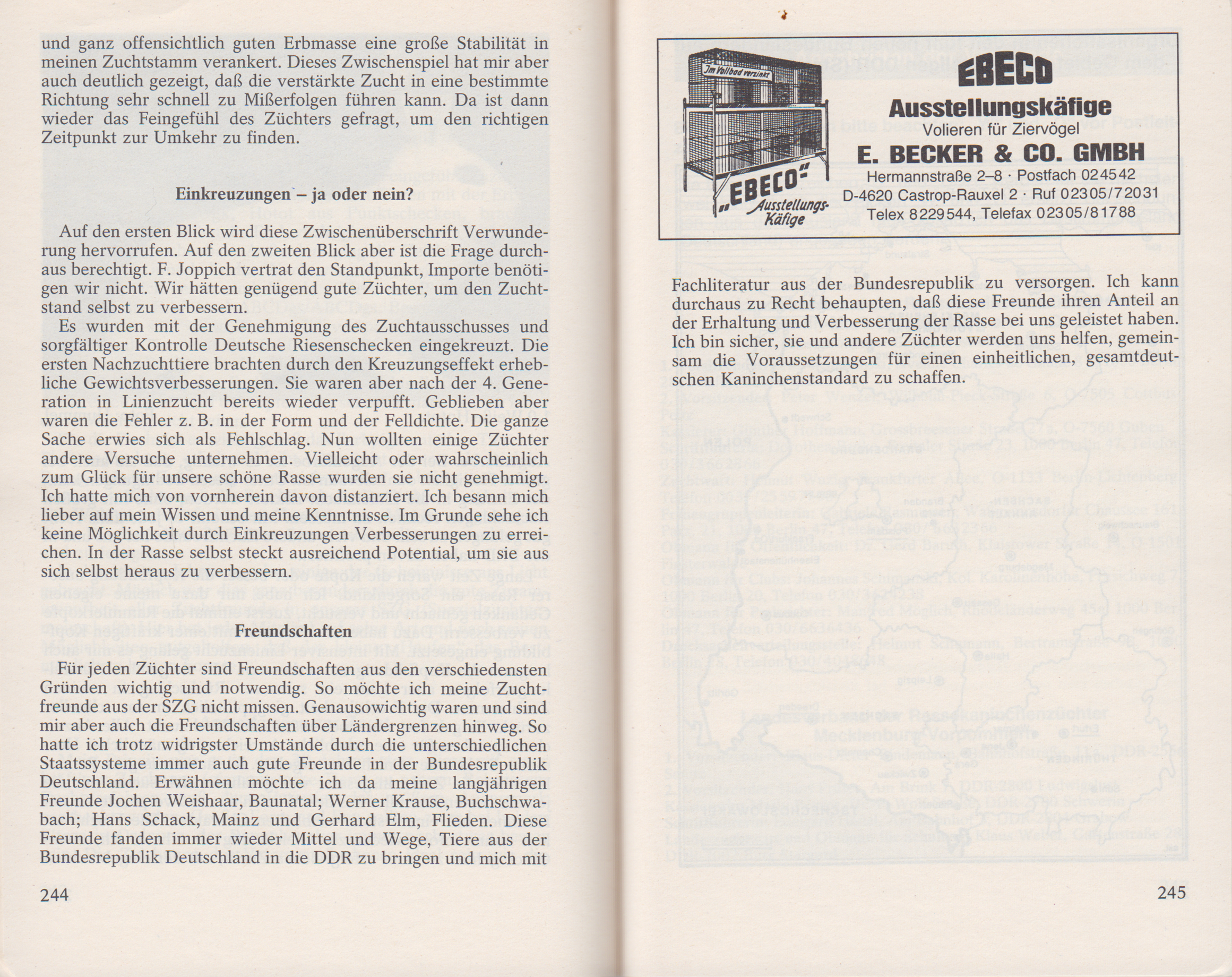 Für jeden Züchter sind Freundschaften aus den verschiedensten Gründen wichtig und notwendig. So möchte ich meine Zuchtfreunde aus der SZG nicht missen. Genauso wichtig waren und sind mir aber auch die Freundschaften über Ländergrenzen hinweg. So hatte ich trotz widrigster Umstände durch die unterschiedlichen Staatssysteme immer auch gute Freunde in der Bundesrepublik Deutschland. Erwähnen möchte ich da meine langjährigen Freunde Jochen Weishaar, Baunatal; Werner Krause, Buchschwabach; Hans Schack, Mainz und Gerhard Elm, Flieden. Diese Freunde fanden immer wieder Mittel und Wege, Tiere aus der Bundesrepublik Deutschland in die DDR zu bringen und mich mit Fachliteratur aus der Bundesrepublik zu versorgen. Ich kann durchaus zu Recht behaupten, dass diese Freunde ihren Anteil an der Erhaltung und Verbesserung der Rasse bei uns geleistet haben. Ich bin sicher, sie und andere Züchter werden uns helfen, gemeinsam die Voraussetzungen für einen einheitlichen, gesamtdeutschen Kaninchenstandard zu schaffen.