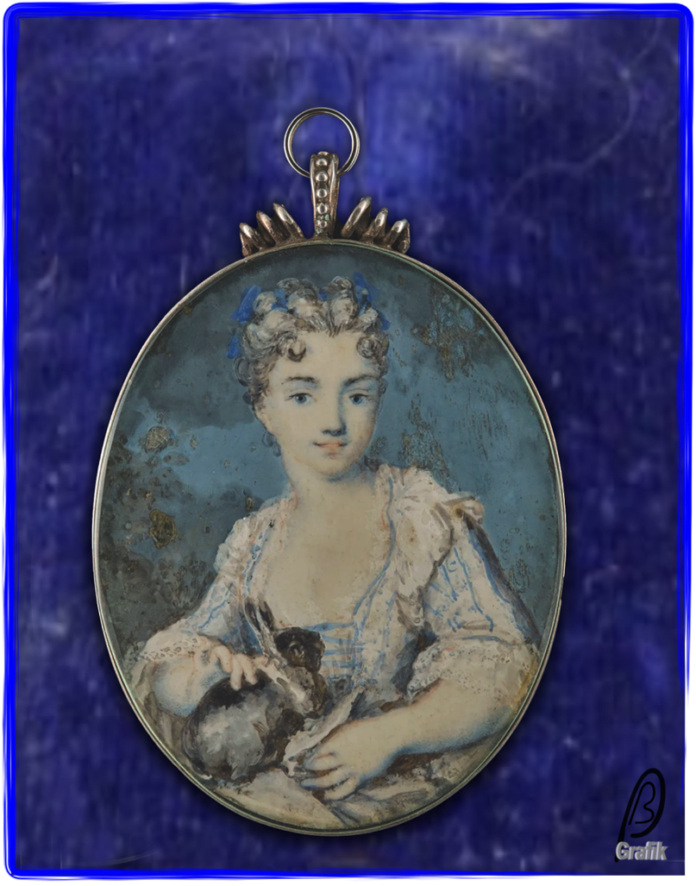Darstellung ein junges Fräulein, mit gepudertem Haar, im blau gemusterten Kleid, zwei kleine Kaninchen haltend.