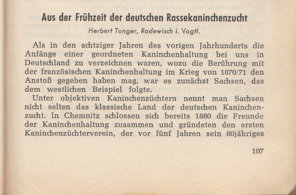 Unter objektiven Kaninchenzüchtern nennt man Sachsen nicht selten das klassische Land der deutschen Kaninchenzucht. In Chemnitz schlossen sich bereits 1880 die Freunde der Kaninchenhaltung zusammen und gründeten den ersten Kaninchenzüchterverein, der 1960 sein 80jähriges Jubiläum begehen konnte. Erst später setzte die Gründung weiterer Vereine, vor allem auch im Westen des Reiches, ein.