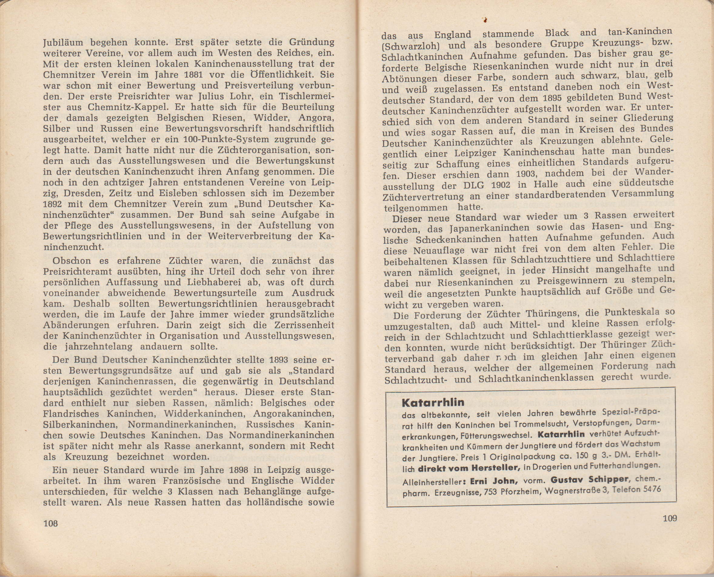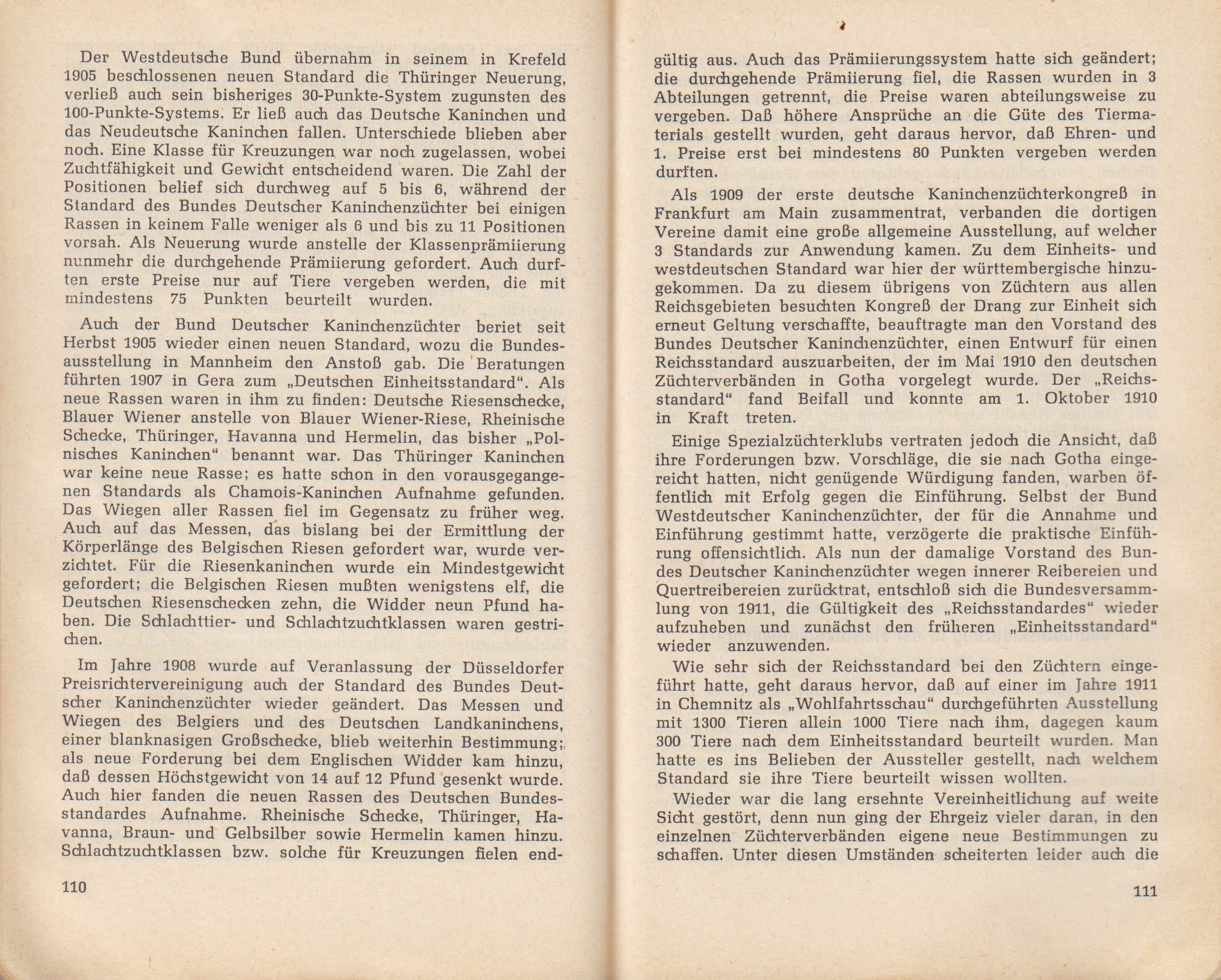 Dieser neue Standard war wieder um 3 Rassen erweitert worden, das Japanerkaninchen sowie das Hasen- und Englische Scheckenkaninchen hatten Aufnahme gefunden. Auch diese Neuauflage war nicht frei von dem alten Fehler. Die beibehaltenen Klassen für Schlachtzuchttiere und Schlachttiere waren nämlich geeignet, in jeder Hinsicht mangelhafte und dabei nur Riesenkaninchen zu Preisgewinnern zu stempeln, weil die angesetzten Punkte hauptsächlich auf Größe und Gewicht zu vergeben waren.