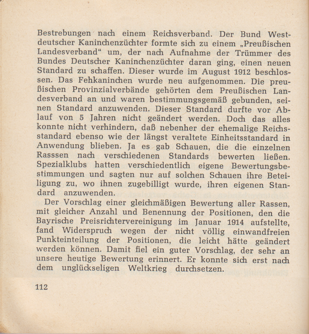 Wieder war die lang ersehnte Vereinheitlichung auf weite Sicht gestört, denn nun ging der Ehrgeiz vieler daran, in den einzelnen Züchterverbänden eigene neue Bestimmungen zu schaffen. Unter diesen Umständen scheiterten leider auch die Bestrebungen nach einem Reichsverband. Der Bund Westdeutscher Kaninchenzüchter formte sich zu einem „Preußischen Landesverband" um, der nach Aufnahme der Trümmer des Bundes Deutscher Kaninchenzüchter daran ging, einen neuen Standard zu schaffen. Dieser wurde im August 1912 beschlossen. Das Fehkaninchen wurde neu aufgenommen. Die preußischen Provinzialverbände gehörten dem Preußischen Landesverband an und waren bestimmungsgemäß gebunden, seinen Standard anzuwenden. Dieser Standard durfte vor Ablauf von 5 Jahren nicht geändert werden. Doch das alles konnte nicht verhindern, dass nebenher der ehemalige Reichsstandard ebenso wie der längst veraltete Einheitsstandard in Anwendung blieben. Ja es gab Schauen, die die einzelnen Rassen nach verschiedenen Standards bewerten ließen.