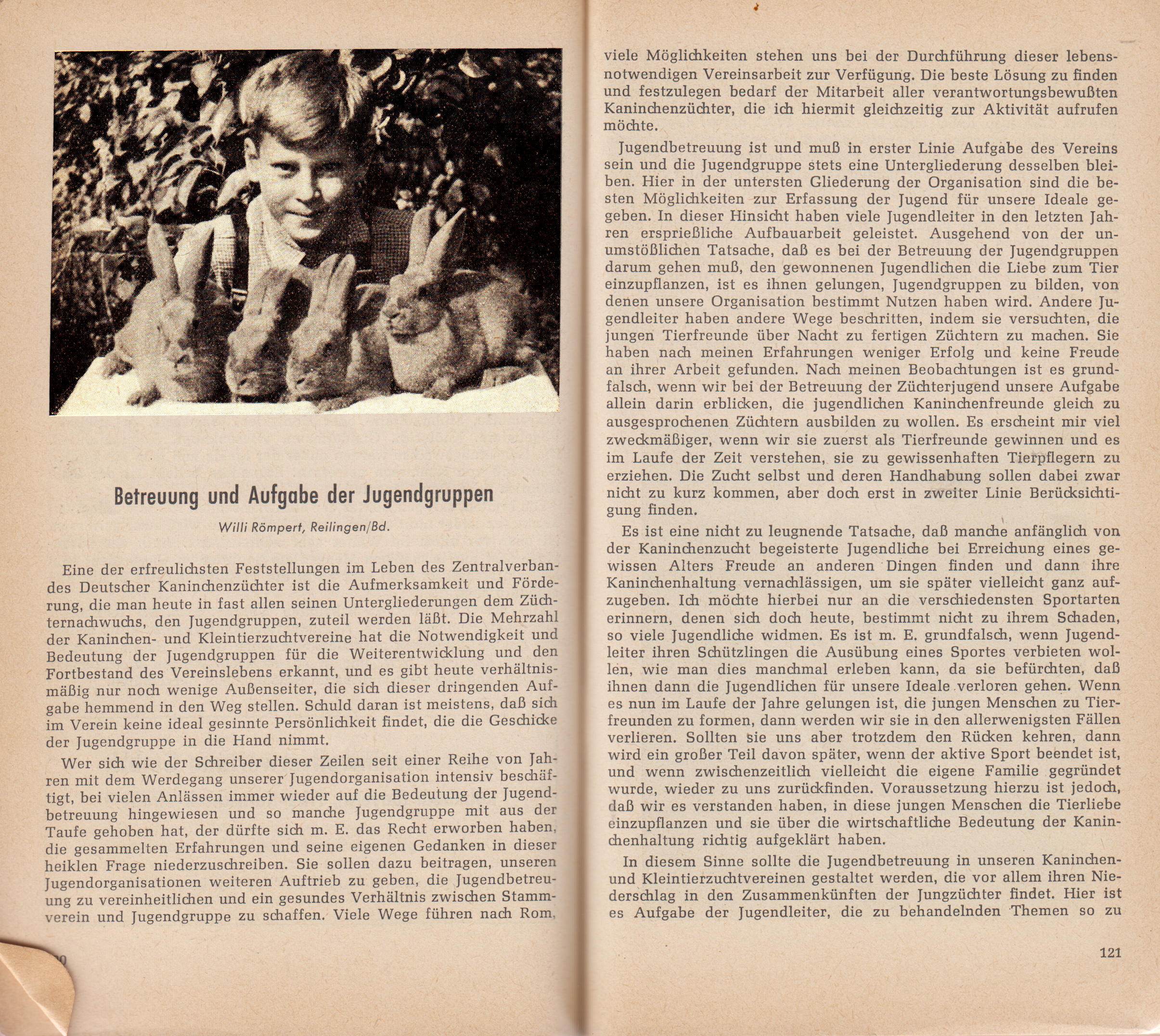 Jugendbetreuung ist und muss in erster Linie Aufgabe des Vereins sein und die Jugendgruppe stets eine Untergliederung desselben bleiben. Hier in der untersten Gliederung der Organisation sind die besten Möglichkeiten zur Erfassung der Jugend für unsere Ideale gegeben. In dieser Hinsicht haben viele Jugendleiter in den letzten Jahren ersprießliche Aufbauarbeit geleistet. Ausgehend von der unumstößlichen Tatsache, dass es bei der Betreuung der Jugendgruppen darum gehen muss, den gewonnenen Jugendlichen die Liebe zum Tier einzupflanzen, ist es ihnen gelungen, Jugendgruppen zu bilden, von denen unsere Organisation bestimmt Nutzen haben wird. Andere Jugendleiter haben andere Wege beschritten, indem sie versuchten, die jungen Tierfreunde über Nacht zu fertigen Züchtern zu machen. Sie haben nach meinen Erfahrungen weniger Erfolg und keine Freude an ihrer Arbeit gefunden. Nach meinen Beobachtungen ist es grund- falsch, wenn wir bei der Betreuung der Züchterjugend unsere Aufgabe allein darin erblicken, die jugendlichen Kaninchenfreunde gleich zu ausgesprochenen Züchtern ausbilden zu wollen. Es erscheint mir viel zweckmäßiger, wenn wir sie zuerst als Tierfreunde gewinnen und es im Laufe der Zeit verstehen, sie zu gewissenhaften Tierpflegern zu erziehen. Die Zucht selbst und deren Handhabung sollen dabei zwar nicht zu kurz kommen, aber doch erst in zweiter Linie Berücksichtigung finden.