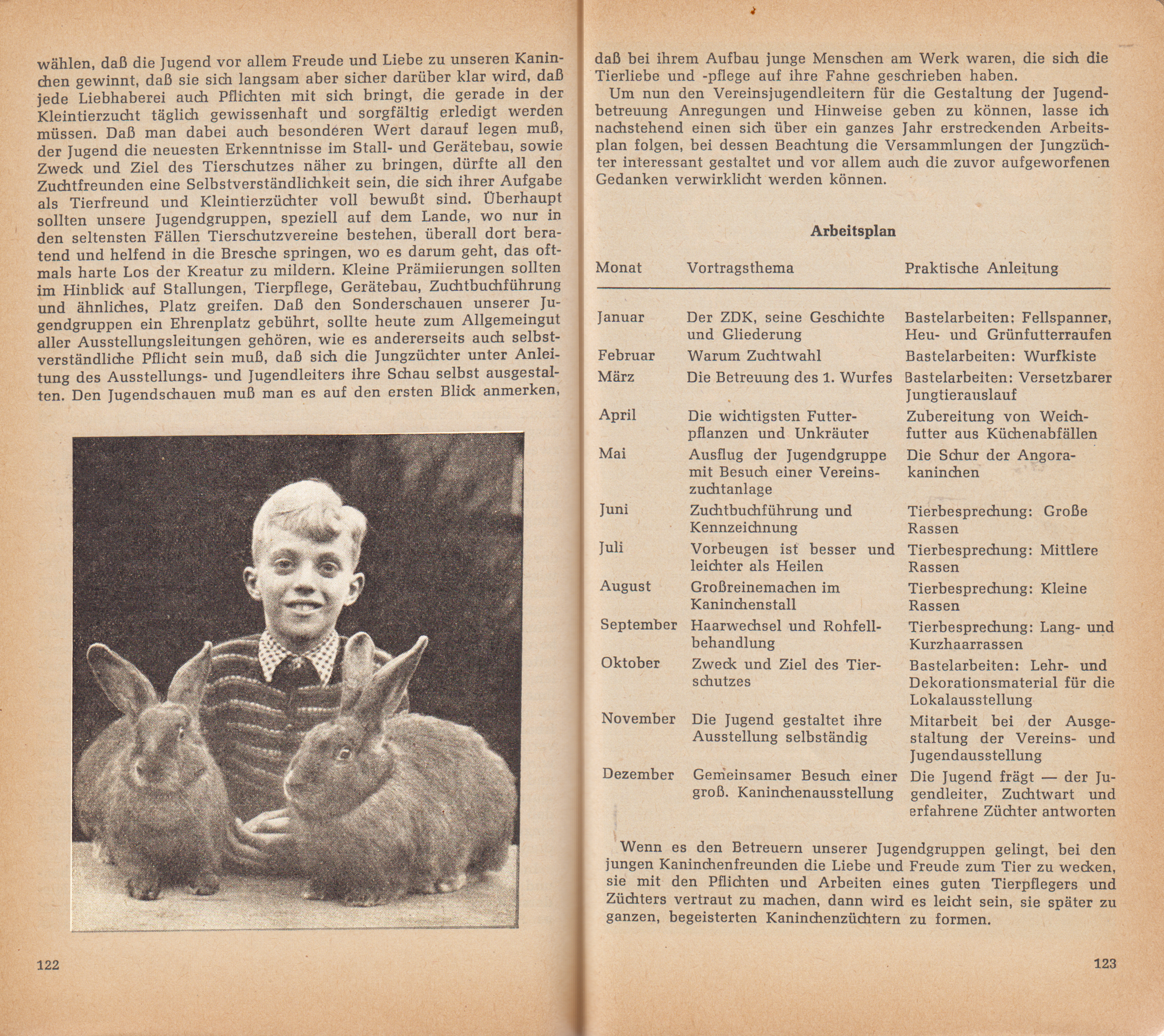 In diesem Sinne sollte die Jugendbetreuung in unseren Kaninchen- und Kleintierzuchtvereinen gestaltet werden, die vor allem ihren Niederschlag in den Zusammenkünften der Jungzüchter findet. Hier ist es Aufgabe der Jugendleiter, die zu behandelnden Themen so zu wählen, dass die Jugend vor allem Freude und Liebe zu unseren Kaninchen gewinnt, dass sie sich langsam aber sicher darüber klar wird, dass jede Liebhaberei auch Pflichten mit sich bringt, die gerade in der Kleintierzucht täglich gewissenhaft und sorgfältig erledigt werden müssen. Dass man dabei auch besonderen Wert darauf legen muss, der Jugend die neuesten Erkenntnisse im Stall- und Gerätebau, sowie Zweck und Ziel des Tierschutzes näher zu bringen, dürfte all den Zuchtfreunden eine Selbstverständlichkeit sein, die sich ihrer Aufgabe als Tierfreund und Kleintierzüchter voll bewusst sind. Überhaupt sollten unsere Jugendgruppen, speziell auf dem Lande, wo nur in den seltensten Fällen Tierschutzvereine bestehen, überall dort beratend und helfend in die Bresche springen, wo es darum geht, dass oftmals harte Los der Kreatur zu mildern. Kleine Prämiierungen sollten im Hinblick auf Stallungen, Tierpflege, Gerätebau, Zuchtbuchführung und ähnliches, Platz greifen. Dass den Sonderschauen unserer Jugendgruppen ein Ehrenplatz gebührt, sollte heute zum Allgemeingut aller Ausstellungsleitungen gehören, wie es andererseits auch selbstverständliche Pflicht sein muss, dass sich die Jungzüchter unter Anleitung des Ausstellungs- und Jugendleiters ihre Schau selbst ausgestalten. Den Jugendschauen muss man es auf den ersten Blick anmerken, dass bei ihrem Aufbau junge Menschen am Werk waren, die sich die Tierliebe und -pflege auf ihre Fahne geschrieben haben. Um nun den Vereinsjugendleitern für die Gestaltung der Jugendbetreuung Anregungen und Hinweise geben zu können, lasse ich nachstehend einen sich über ein ganzes Jahr erstreckenden Arbeitsplan folgen, bei dessen Beachtung die Versammlungen der Jungzüchter interessant gestaltet und vor allem auch die zuvor aufgeworfenen Gedanken verwirklicht werden können.