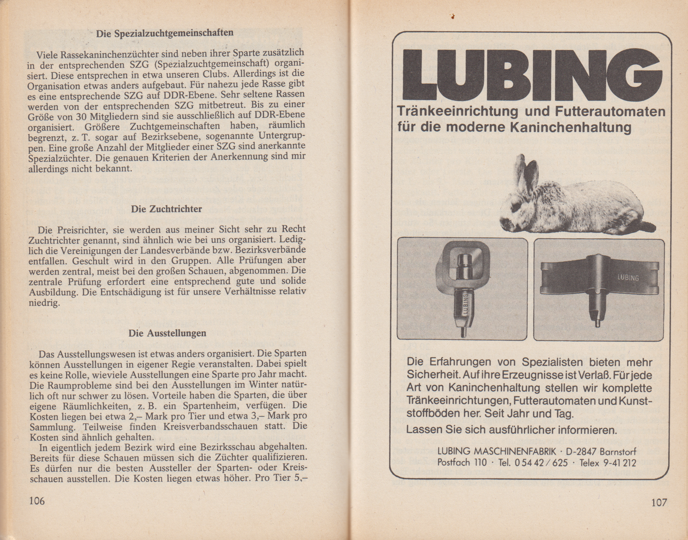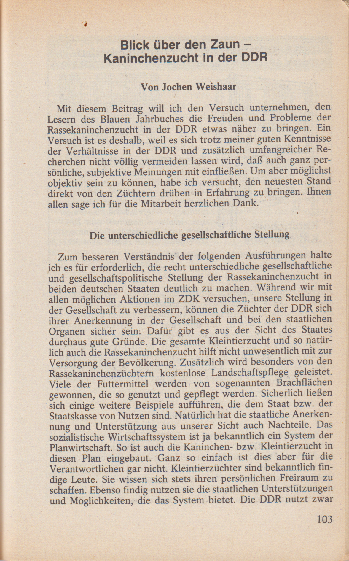 Mit diesem Beitrag will ich den Versuch unternehmen, den Lesern des Blauen Jahrbuches die Freuden und Probleme der Rassekaninchenzucht in der DDR etwas näher zu bringen. Ein Versuch ist es deshalb, weil es sich trotz meiner guten Kenntnisse der Verhältnisse in der DDR und zusätzlich umfangreicher Recherchen nicht völlig vermeiden lassen wird, dass auch ganz persönliche, subjektive Meinungen mit einfließen. Um aber möglichst objektiv sein zu können, habe ich versucht, den neuesten Stand direkt von den Züchtern drüben in Erfahrung zu bringen. Ihnen allen sage ich für die Mitarbeit herzlichen Dank. Die unterschiedliche gesellschaftliche Stellung Zum besseren Verständnis der folgenden Ausführungen halte ich es für erforderlich, die recht unterschiedliche gesellschaftliche und gesellschaftspolitische Stellung der Rassekaninchenzucht in beiden deutschen Staaten deutlich zu machen. Während wir mit allen möglichen Aktionen im ZDK versuchen, unsere Stellung in der Gesellschaft zu verbessern, können die Züchter der DDR sich ihrer Anerkennung in der Gesellschaft und bei den staatlichen Organen sicher sein. Dafür gibt es aus der Sicht des Staates durchaus gute Gründe. Die gesamte Kleintierzucht und so natürlich auch die Rassekaninchenzucht hilft nicht unwesentlich mit zur Versorgung der Bevölkerung. Zusätzlich wird besonders von den Rassekaninchenzüchtern kostenlose Landschaftspflege geleistet. Viele der Futtermittel werden von sogenannten Brachflächen gewonnen, die so genutzt und gepflegt werden. Sicherlich ließen sich einige weitere Beispiele aufführen, die dem Staat bzw. der Staatskasse von Nutzen sind. Natürlich hat die staatliche Anerkennung und Unterstützung aus unserer Sicht auch Nachteile. Das sozialistische Wirtschaftssystem ist ja bekanntlich ein System der Planwirtschaft. So ist auch die Kaninchen- bzw. Kleintierzucht in diesen Plan eingebaut. Ganz so einfach ist dies aber für die Verantwortlichen gar nicht. Kleintierzüchter sind bekanntlich findige Leute. Sie wissen sich stets ihren persönlichen Freiraum zu schaffen. Ebenso findig nutzen sie die staatlichen Unterstützungen und Möglichkeiten, die das System bietet. Die DDR nutzt zwar einerseits die Kleintierzucht und so auch die Kaninchenzucht allgemein. Andererseits anerkennt sie aber die Arbeit der Züchter. Eine Sache, die auch unseren staatlichen Stellen durchaus gut zu Gesicht stehen würde. Wir sind zwar nicht zur Versorgung der Bevölkerung erforderlich, aber die wirtschaftliche Seite unserer Kleintierzucht ist eine Überlegung wert. Es sind doch eine ganze Anzahl von Arbeitsplätzen in der Futtermittel- und Zubehörindustrie, die durch unsere Kaufkraft am Leben gehalten werden. Arbeitsplätze, die es in dieser Form in der DDR sicher nicht gibt.