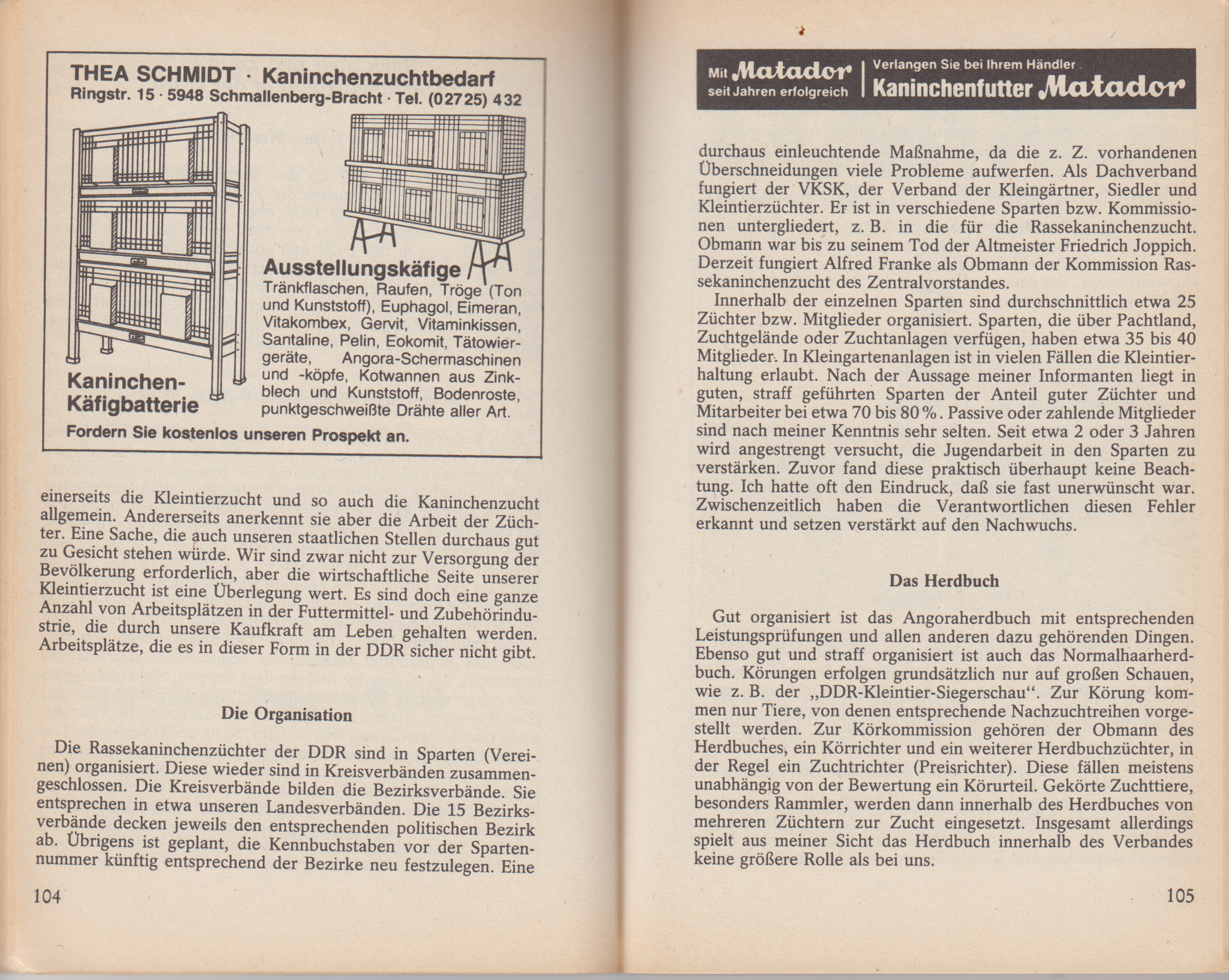 Gut organisiert ist das Angoraherdbuch mit entsprechenden Leistungsprüfungen und allen anderen dazu gehörenden Dingen. Ebenso gut und straff organisiert ist auch das Normalhaarherdbuch. Körungen erfolgen grundsätzlich nur auf großen Schauen, wie z. B. der „DDR-Kleintier-Siegerschau“. Zur Körung kommen nur Tiere, von denen entsprechende Nachzuchtreihen vorgestellt werden. Zur Körkommission gehören der Obmann des Herdbuches, ein Körrichter und ein weiterer Herdbuchzüchter, in der Regel ein Zuchtrichter (Preisrichter). Diese fällen meistens unabhängig von der Bewertung ein Körurteil. Gekörte Zuchttiere, besonders Rammler, werden dann innerhalb des Herdbuches von mehreren Züchtern zur Zucht eingesetzt. Insgesamt allerdings spielt aus meiner Sicht das Herdbuch innerhalb des Verbandes keine größere Rolle als bei uns.