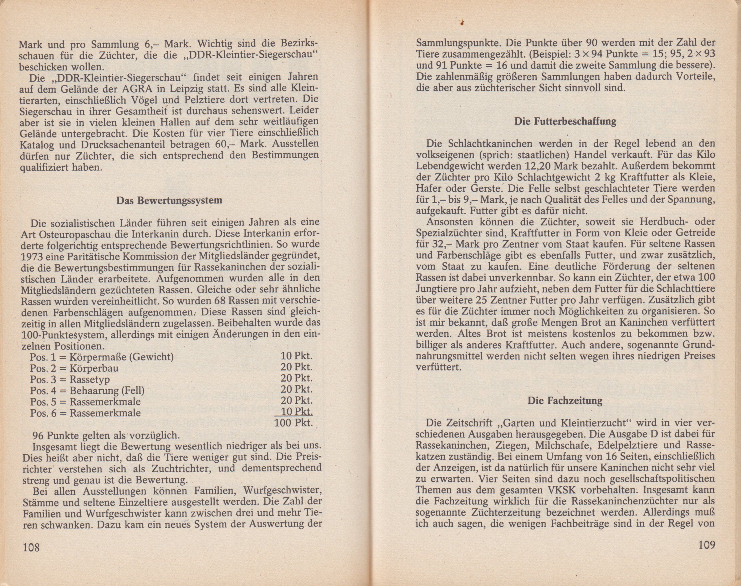 Ansonsten können die Züchter, soweit sie Herdbuch- oder Spezialzüchter sind, Kraftfutter in Form von Kleie oder Getreide für 32,- Mark pro Zentner vom Staat kaufen. Für seltene Rassen und Farbenschläge gibt es ebenfalls Futter, und zwar zusätzlich, vom Staat zu kaufen. Eine deutliche Förderung der seltenen Rassen ist dabei unverkennbar. So kann ein Züchter, der etwa 100 Jungtiere pro Jahr aufzieht, neben dem Futter für die Schlachttiere über weitere 25 Zentner Futter pro Jahr verfügen. Zusätzlich gibt es für die Züchter immer noch Möglichkeiten zu organisieren. So ist mir bekannt, dass große Mengen Brot an Kaninchen verfüttert werden. Altes Brot ist meistens kostenlos zu bekommen bzw. billiger als anderes Kraftfutter. Auch andere, sogenannte Grundnahrungsmittel werden nicht selten wegen ihres niedrigen Preises verfüttert.