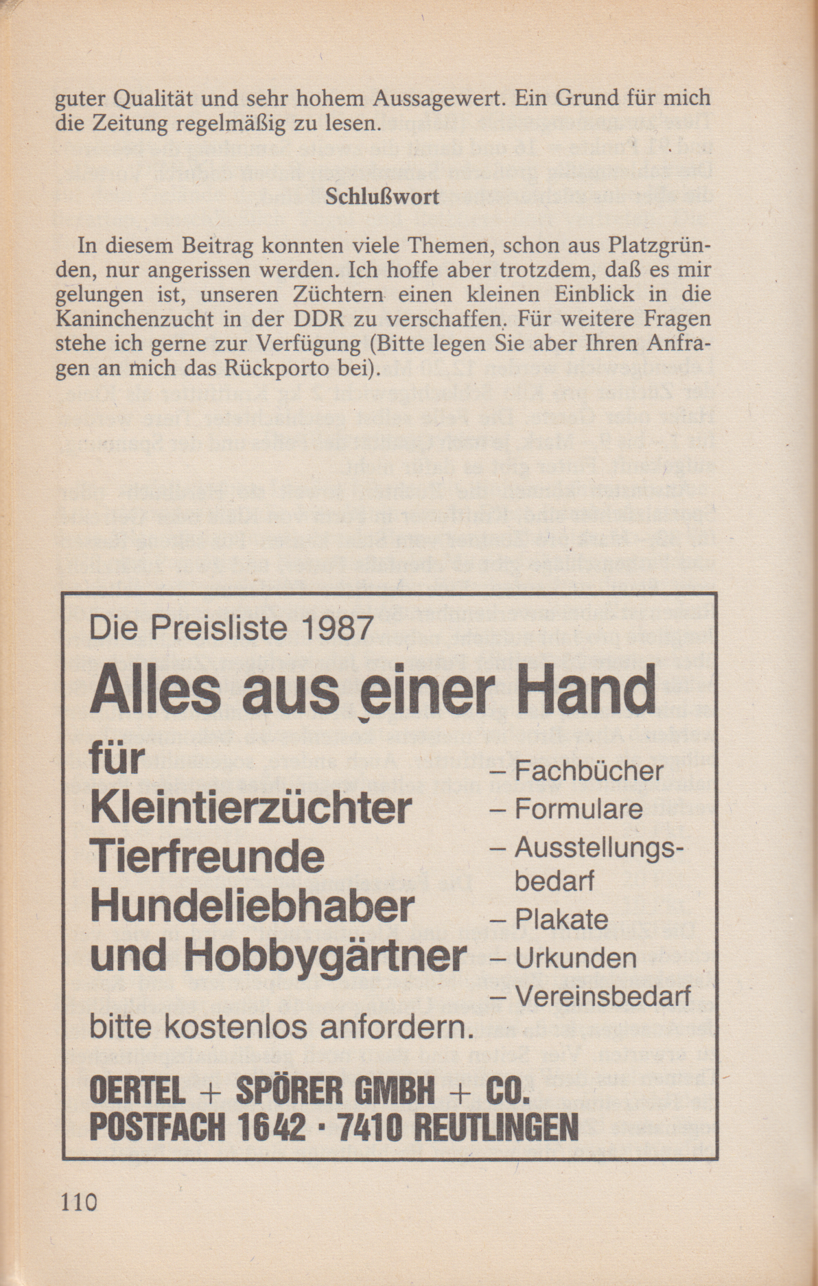 In diesem Beitrag konnten viele Themen, schon aus Platzgründen, nur angerissen werden. Ich hoffe aber trotzdem, dass es mir gelungen ist, unseren Züchtern einen kleinen Einblick in die Kaninchenzucht in der DDR zu verschaffen. Für weitere Fragen stehe ich gerne zur Verfügung (Bitte legen Sie aber Ihren Anfragen an mich das Rückporto bei).