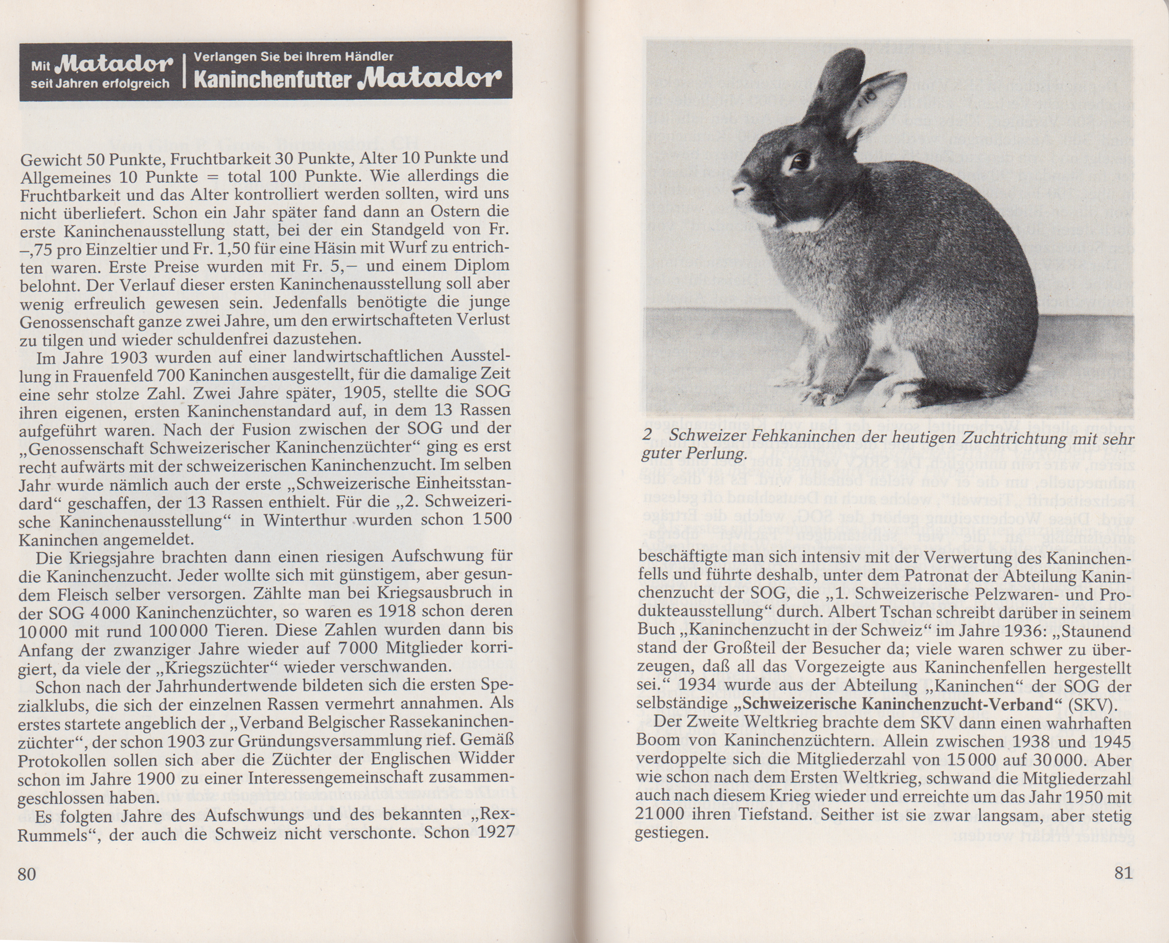 Es folgten Jahre des Aufschwungs und des bekannten „Rex- Rummels", der auch die Schweiz nicht verschonte. Schon 1927 beschäftigte man sich intensiv mit der Verwertung des Kaninchenfells und führte deshalb, unter dem Patronat der Abteilung Kaninchenzucht der SOG, die „1. Schweizerische Pelzwaren- und Produkteausstellung“ durch. Albert Tschan schreibt darüber in seinem Buch „Kaninchenzucht in der Schweiz“ im Jahre 1936: „Staunend stand der Großteil der Besucher da; viele waren schwer zu überzeugen, dass all das Vorgezeigte aus Kaninchenfellen hergestellt sei.“ 1934 wurde aus der Abteilung „Kaninchen" der SOG der selbständige „Schweizerische Kaninchenzucht-Verband" (SKV).