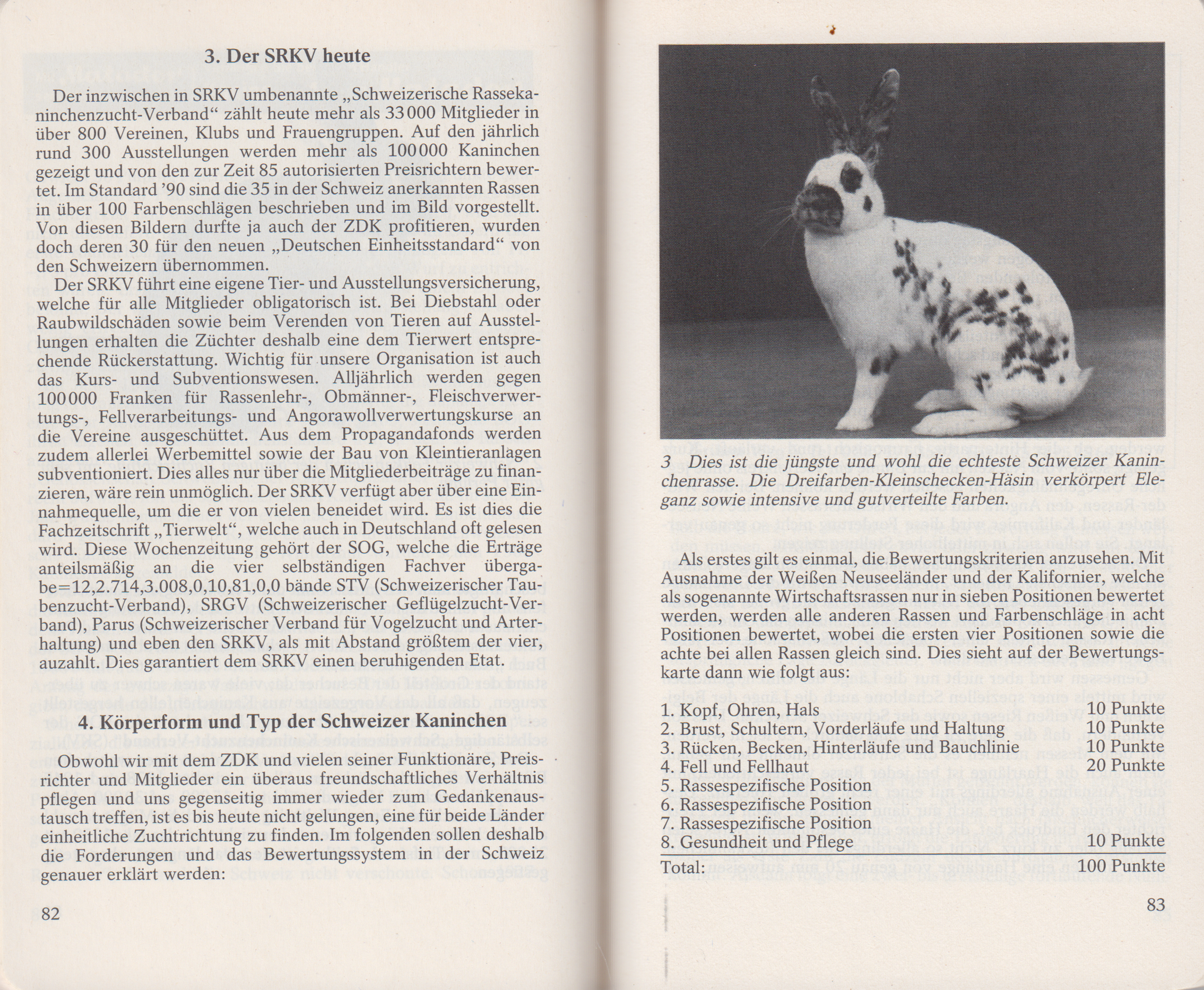 Der inzwischen in SRKV umbenannte „Schweizerische Rassekaninchenzucht-Verband“ zählt heute mehr als 33000 Mitglieder in über 800 Vereinen, Klubs und Frauengruppen. Auf den jährlich rund 300 Ausstellungen werden mehr als 100000 Kaninchen gezeigt und von den zurzeit 85 autorisierten Preisrichtern bewertet. Im Standard '90 sind die 35 in der Schweiz anerkannten Rassen in über 100 Farbenschlägen beschrieben und im Bild vorgestellt. Von diesen Bildern durfte ja auch der ZDK profitieren, wurden doch deren 30 für den neuen „Deutschen Einheitsstandard“ von den Schweizern übernommen.