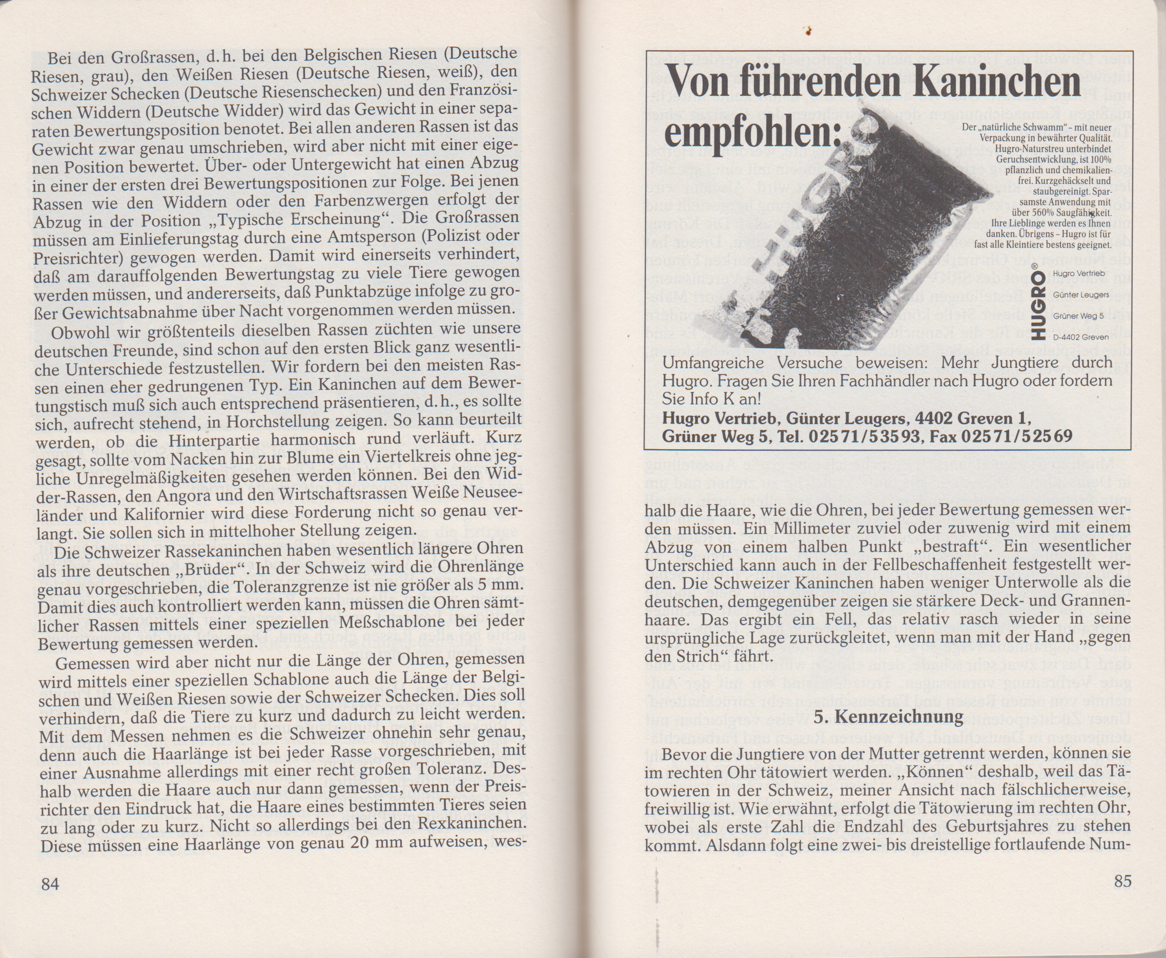 Bevor die Jungtiere von der Mutter getrennt werden, können sie im rechten Ohr tätowiert werden „Können“ deshalb, weil das Tätowieren in der Schweiz, meiner Ansicht nach fälschlicherweise, freiwillig ist. Wie erwähnt, erfolgt die Tätowierung im rechten Ohr, wobei als erste Zahl die Endzahl des Geburtsjahres zu stehen kommt. Alsdann folgt eine zwei- bis dreistellige fortlaufende Nummer. Obwohl das Tätowieren nicht obligatorisch ist, werden falsch tätowierte Tiere mit einem Punktabzug in der Position Gesundheit und Pflege bestraft. Dies vor allem deshalb, damit keine unrechtmäßigen Kennzeichnungen den Preisrichtern den Besitzer eines Tieres verraten. All jene Tiere, welche man ausstellen möchte, werden im Herbst gekört. Die Körung erfolgt im linken Ohr, indem mit einer speziellen Zange ein kleines Loch ins Ohr gestanzt wird. Alsdann wird dort eine Ohrmarke, aus einer Aluminiumlegierung hergestellt und mit einer sechsstelligen Nummer versehen, eingesetzt. Die Körung darf nur vom Vereinsobmann vorgenommen werden. Dieser hat die Nummer der Ohrmarken auch zu notieren. Ohrmarken können im Materialdepot des SRKV auf schriftliche, mit dem Vereinsstempel versehene Bestellungen hin bezogen werden. Stichwort Materialdepot: Bei dieser Stelle können nicht nur Ohrmarken, sondern alle Materialien für die Kaninchenzucht bezogen werden. Es sind dies beispielsweise Bücher, Stallkarten, Standard, Messschablonen, Tätowierwerkzeug, Tusche und vieles andere mehr.