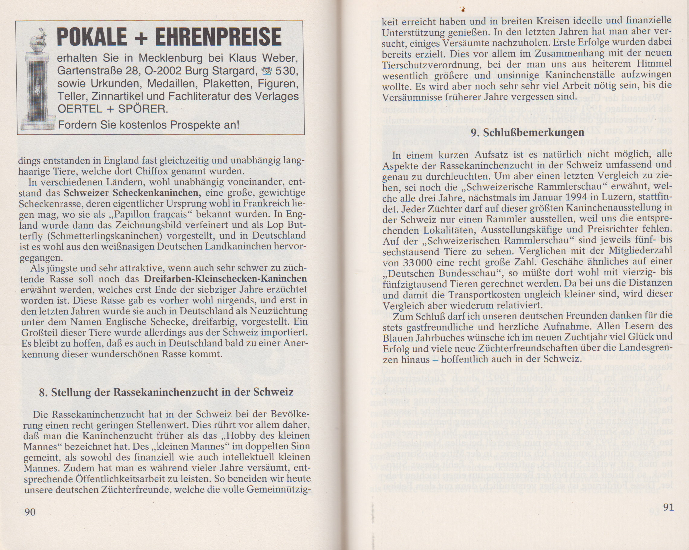 In einem kurzen Aufsatz ist es natürlich nicht möglich, alle Aspekte der Rassekaninchenzucht in der Schweiz umfassend und genau zu durchleuchten. Um aber einen letzten Vergleich zu ziehen, sei noch die „Schweizerische Rammlerschau“ erwähnt, welche alle drei Jahre, nächstmals im Januar 1994 in Luzern, stattfindet. Jeder Züchter darf auf dieser größten Kaninchenausstellung in der Schweiz nur einen Rammler ausstellen, weil uns die entsprechenden Lokalitäten, Ausstellungskäfige und Preisrichter fehlen. Auf der „Schweizerischen Rammlerschau“ sind jeweils fünf- bis sechstausend Tiere zu sehen. Verglichen mit der Mitgliederzahl von 33000 eine recht große Zahl. Geschähe ähnliches auf einer „Deutschen Bundesschau", so müsste dort wohl mit vierzig- bis fünfzigtausend Tieren gerechnet werden. Da bei uns die Distanzen und damit die Transportkosten ungleich kleiner sind, wird dieser Vergleich aber wiederum relativiert.