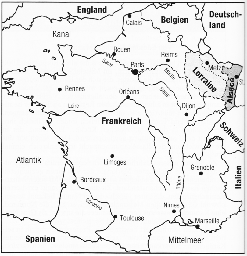 Karte von Frankreich mit den beiden Grenzregionen Elsaß (Alsace) und Lothringen (Lorraine). Das Elsaß gliedert sich in die beiden Departements Bas-Rhin und Haut-Rhin. Das Departement Moselle (Metz) war bis 1918 Bestandteil des „Reichslandes“ Elsass-Lothringen.