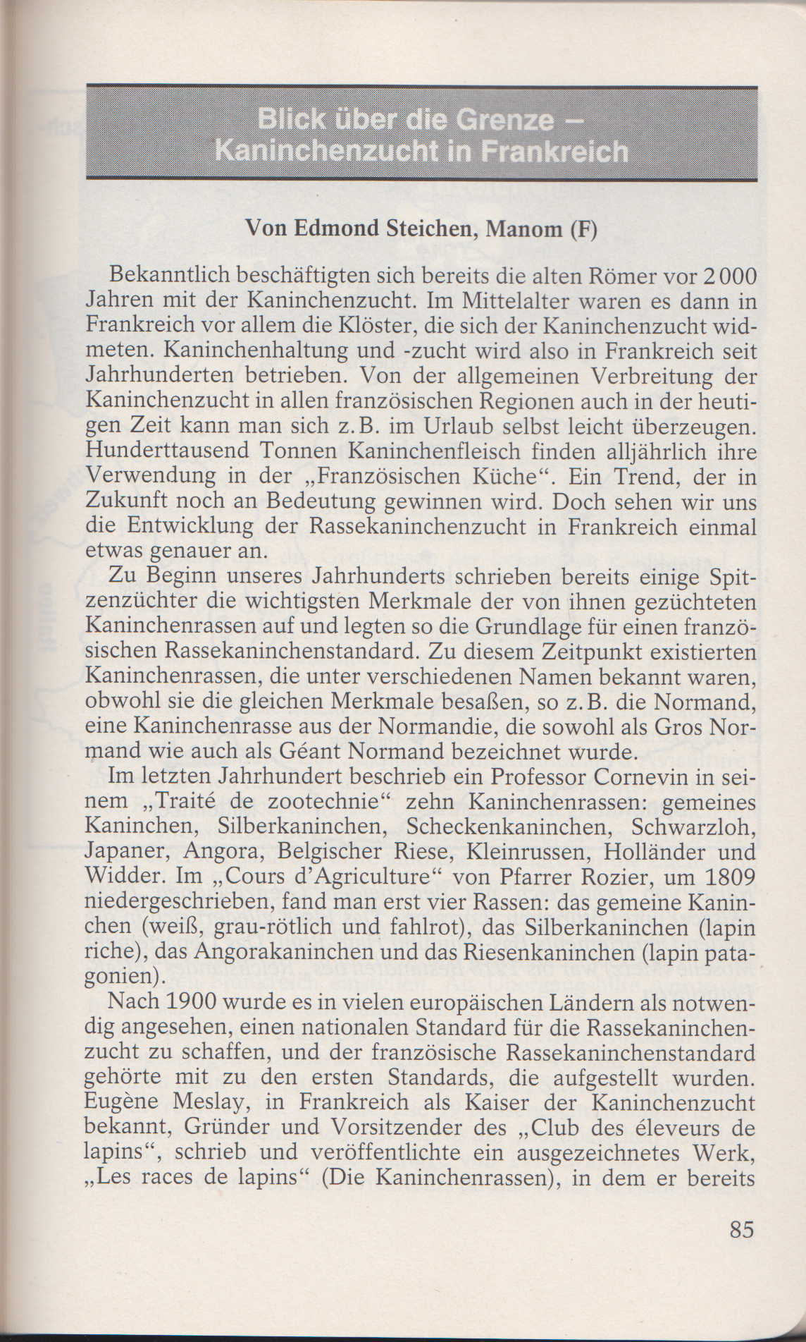 Bekanntlich beschäftigten sich bereits die alten Römer vor 2000 Jahren mit der Kaninchenzucht. Im Mittelalter waren es dann in Frankreich vor allem die Klöster, die sich der Kaninchenzucht widmeten. Kaninchenhaltung und -zucht wird also in Frankreich seit Jahrhunderten betrieben. Von der allgemeinen Verbreitung der Kaninchenzucht in allen französischen Regionen auch in der heutigen Zeit kann man sich z. B. im Urlaub selbst leicht überzeugen. Hunderttausend Tonnen Kaninchenfleisch finden alljährlich ihre Verwendung in der „Französischen Küche". Ein Trend, der in Zukunft noch an Bedeutung gewinnen wird. Doch sehen wir uns die Entwicklung der Rassekaninchenzucht in Frankreich einmal etwas genauer an.