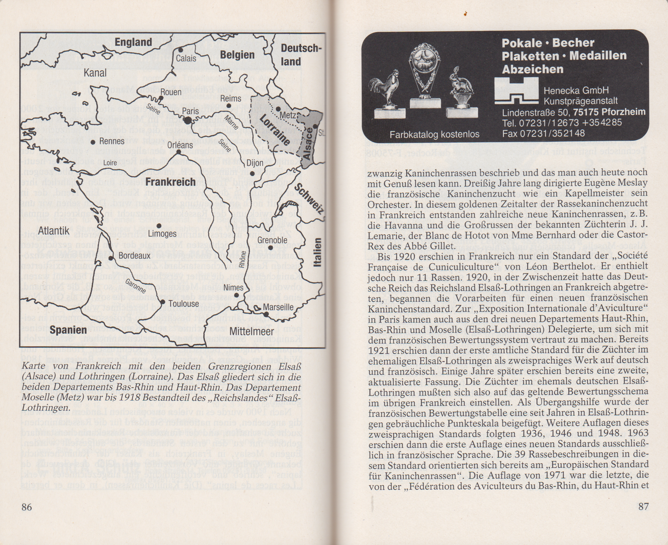 Im Elsaß und im benachbarten Departement Moselle gibt es etwa 230 Kleintierzuchtvereine. Diese sind in der ,,Fédération Alsace-Moselle" organisiert und zählen zusammen etwa 3500 Mitglieder. Der Verband wurde 1919 gegründet, sein Sitz ist in Straßburg. Zu diesem Verband gehören aus dem Departement Moselle 6 Kreisverbände mit 82 Ortsvereinen und 2 Spezialklubs (einer für Tauben und einer für Kaninchen), aus dem Oberelsass 5 Kreisverbände mit 61 Ortsvereinen und 4 Spezialklubs und aus dem Unterelsass 74 Ortsvereine und 4 Spezialklubs. Die Aufteilung der Kreisverbände und Ortsvereine in Frankreich ist sehr unterschiedlich und folgt nicht der politischen Gliederung des Landes. Da das ehe- malige Reichsland Elsass-Lothringen von 1871 bis 1918 zum Deutschen Kaiserreich gehörte, finden wir in den heutigen drei Departements auf diesem Territorium (Bas-Rhin, Haut-Rhin und Moselle) noch denselben Aufbau der organisierten Kleintierzucht wie in Deutschland. Auch die anderen französischen Züchter orientieren sich an diesem Modell. Außerhalb dieser drei Departements gibt es in Frankreich ca. 200 gemischte Kleintierzuchtvereine (Kaninchen, Tauben, Geflügel) und diverse Spezialklubs.