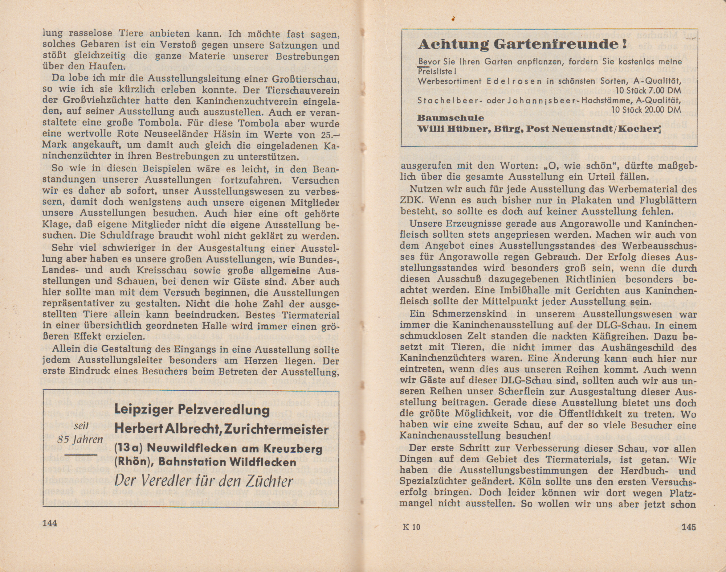 Da lobe ich mir die Ausstellungsleitung einer Großtierschau, so wie ich sie kürzlich erleben konnte. Der Tierschauverein der Großviehzüchter hatte den Kaninchenzuchtverein eingeladen, auf seiner Ausstellung auch auszustellen. Auch er veranstaltete eine große Tombola. Für diese Tombola aber wurde eine wertvolle Rote Neuseeländer Häsin im Werte von 25.- Mark angekauft, um damit auch gleich die eingeladenen Kaninchenzüchter in ihren Bestrebungen zu unterstützen.