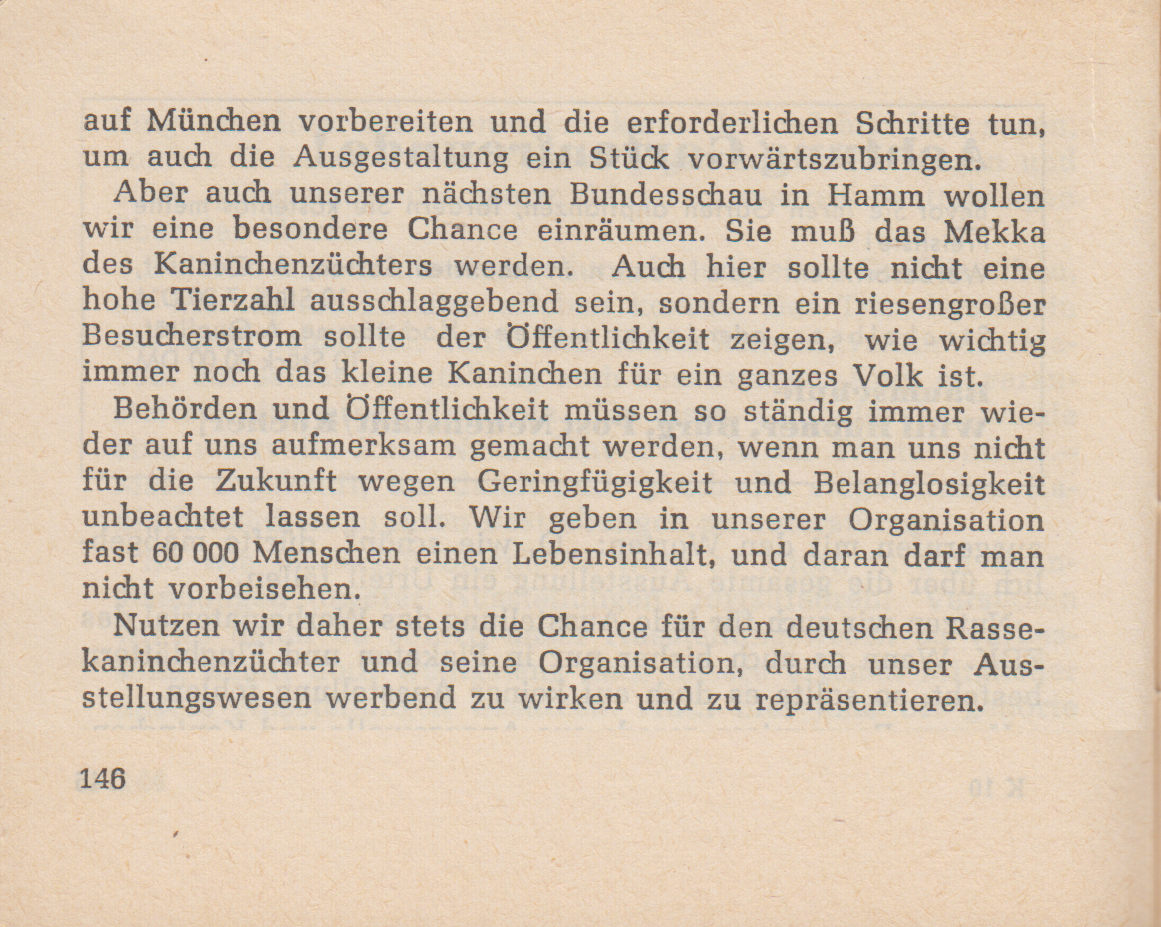 Aber auch unserer nächsten Bundesschau in Hamm wollen wir eine besondere Chance einräumen. Sie muss das Mekka des Kaninchenzüchters werden. Auch hier sollte nicht eine hohe Tierzahl ausschlaggebend sein, sondern ein riesengroßer Besucherstrom sollte der Öffentlichkeit zeigen, wie wichtig immer noch das kleine Kaninchen für ein ganzes Volk ist.
