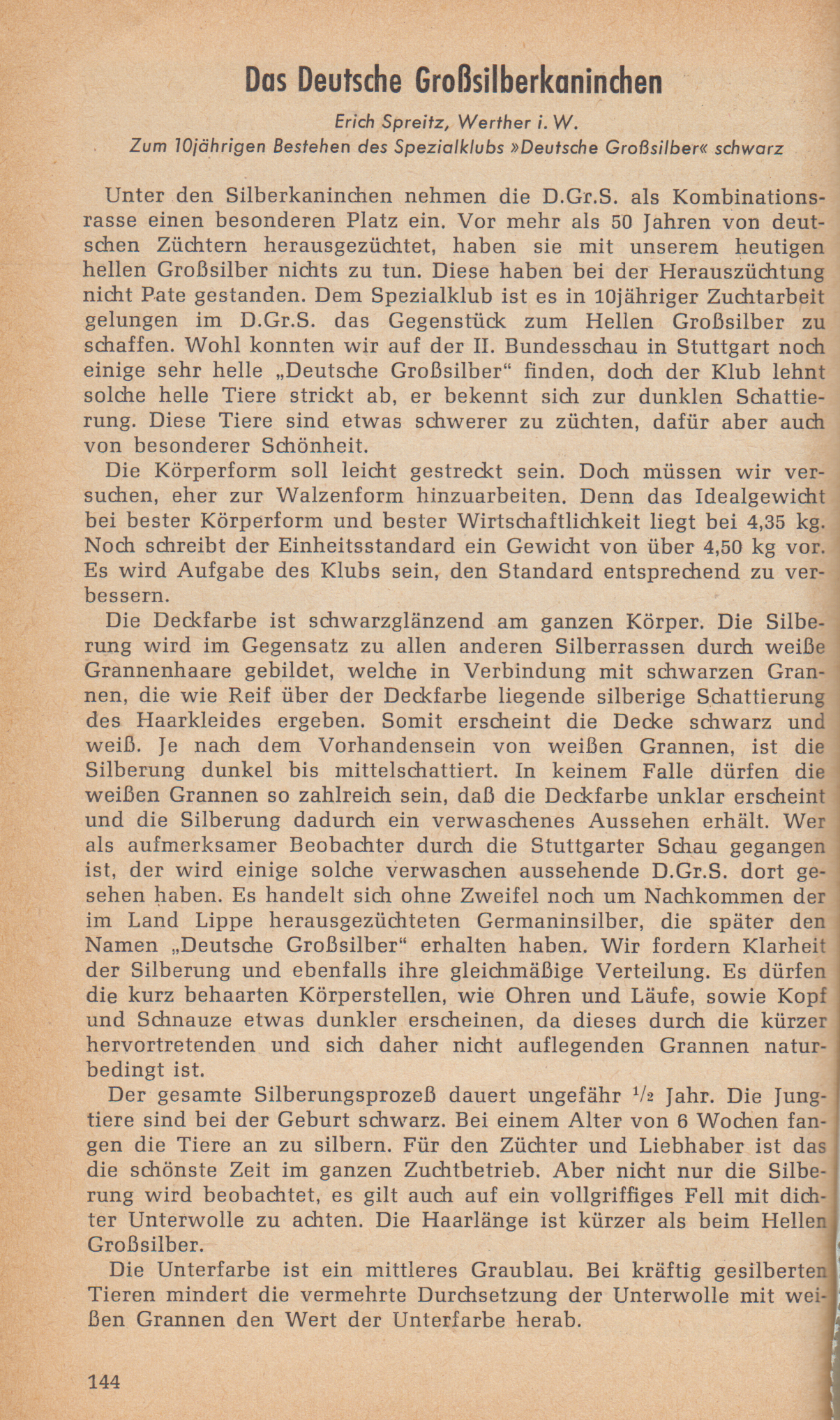 Dem Spezialklub ist es in 10jähriger Zuchtarbeit gelungen im D.Gr.S. das Gegenstück zum Hellen Großsilber zu schaffen. Wohl konnten wir auf der II. Bundesschau in Stuttgart noch einige sehr helle „Deutsche Großsilber“ finden, doch der Klub lehnt solche helle Tiere strikt ab, er bekennt sich zur dunklen Schattierung. Diese Tiere sind etwas schwerer zu züchten, dafür aber auch von besonderer Schönheit. Die Körperform soll leicht gestreckt sein. Doch müssen wir versuchen, eher zur Walzenform hinzuarbeiten. Denn das Idealgewicht bei bester Körperform und bester Wirtschaftlichkeit liegt bei 4,35 kg. Noch schreibt der Einheitsstandard ein Gewicht von über 4,50 kg vor. Es wird Aufgabe des Klubs sein, den Standard entsprechend zu verbessern. Die Deckfarbe ist schwarzglänzend am ganzen Körper. Die Silberung wird im Gegensatz zu allen anderen Silberrassen durch weiße Grannenhaare gebildet, welche in Verbindung mit schwarzen Grannen, die wie Reif über der Deckfarbe liegende silberige Schattierung des Haarkleides ergeben. Somit erscheint die Decke schwarz und weiß. Je nach dem Vorhandensein von weißen Grannen, ist die Silberung dunkel bis mittelschattiert. In keinem Falle dürfen die weißen Grannen so zahlreich sein, dass die Deckfarbe unklar erscheint und die Silberung dadurch ein verwaschenes Aussehen erhält. Wer als aufmerksamer Beobachter durch die Stuttgarter Schau gegangen ist, der wird einige solche verwaschen aussehende D.Gr.S. dort gesehen haben. Es handelt sich ohne Zweifel noch um Nachkommen der im Land Lippe herausgezüchteten Germaniasilber, die später den Namen „Deutsche Großsilber" erhalten haben. Wir fordern Klarheit der Silberung und ebenfalls ihre gleichmäßige Verteilung. Es dürfen die kurz behaarten Körperstellen, wie Ohren und Läufe, sowie Kopf und Schnauze etwas dunkler erscheinen, da dieses durch die kürzer hervortretenden und sich daher nicht auflegenden Grannen natur- bedingt ist. Der gesamte Silberungsprozess dauert ungefähr 1/2 Jahr. Die Jungtiere sind bei der Geburt schwarz. Bei einem Alter von 6 Wochen fangen die Tiere an zu silbern. Für den Züchter und Liebhaber ist das die schönste Zeit im ganzen Zuchtbetrieb. Aber nicht nur die Silberung wird beobachtet, es gilt auch auf ein vollgriffiges Fell mit dichter Unterwolle zu achten. Die Haarlänge ist kürzer als beim Hellen Großsilber. Die Unterfarbe ist ein mittleres Graublau. Bei kräftig gesilberten Tieren mindert die vermehrte Durchsetzung der Unterwolle mit weißen Grannen den Wert der Unterfarbe herab.