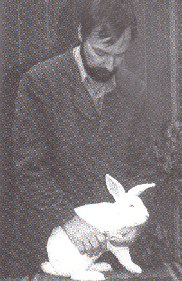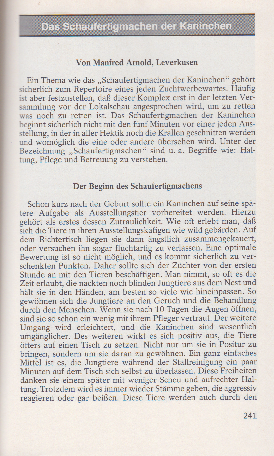 Schon kurz nach der Geburt sollte ein Kaninchen auf seine spätere Aufgabe als Ausstellungstier vorbereitet werden. Hierzu gehört als erstes dessen Zutraulichkeit. Wie oft erlebt man, dass sich die Tiere in ihren Ausstellungskäfigen wie wild gebärden. Auf dem Richtertisch liegen sie dann ängstlich zusammengekauert, oder versuchen ihn sogar fluchtartig zu verlassen. Eine optimale Bewertung ist so nicht möglich, und es kommt sicherlich zu ver- schenkten Punkten. Daher sollte sich der Züchter von der ersten Stunde an mit den Tieren beschäftigen. Man nimmt, so oft es die Zeit erlaubt, die nackten noch blinden Jungtiere aus dem Nest und hält sie in den Händen, am besten so viele wie hineinpassen. So gewöhnen sich die Jungtiere an den Geruch und die Behandlung durch den Menschen. Wenn sie nach 10 Tagen die Augen öffnen, sind sie so schon ein wenig mit ihrem Pfleger vertraut. Der weitere Umgang wird erleichtert, und die Kaninchen sind wesentlich umgänglicher. Desweiteren wirkt es sich positiv aus, die Tiere öfters auf einen Tisch zu setzen. Nicht nur um sie in Positur zu bringen, sondern um sie daran zu gewöhnen. Ein ganz einfaches Mittel ist es, die Jungtiere während der Stallreinigung ein paar Minuten auf dem Tisch sich selbst zu überlassen. Diese Freiheiten danken sie einem später mit weniger Scheu und aufrechter Haltung. Trotzdem wird es immer wieder Stämme geben, die aggressiv reagieren oder gar beißen. Diese Tiere werden auch durch den geduldigsten Züchter nicht zahm. Diese Übel sollte man durch strenge Selektion ausmerzen. Bringt auch das Einkreuzen von zahmeren Artgenossen nicht den gewünschten Erfolg, so erscheint es ratsam, sich komplett von diesem Stamm zu trennen.