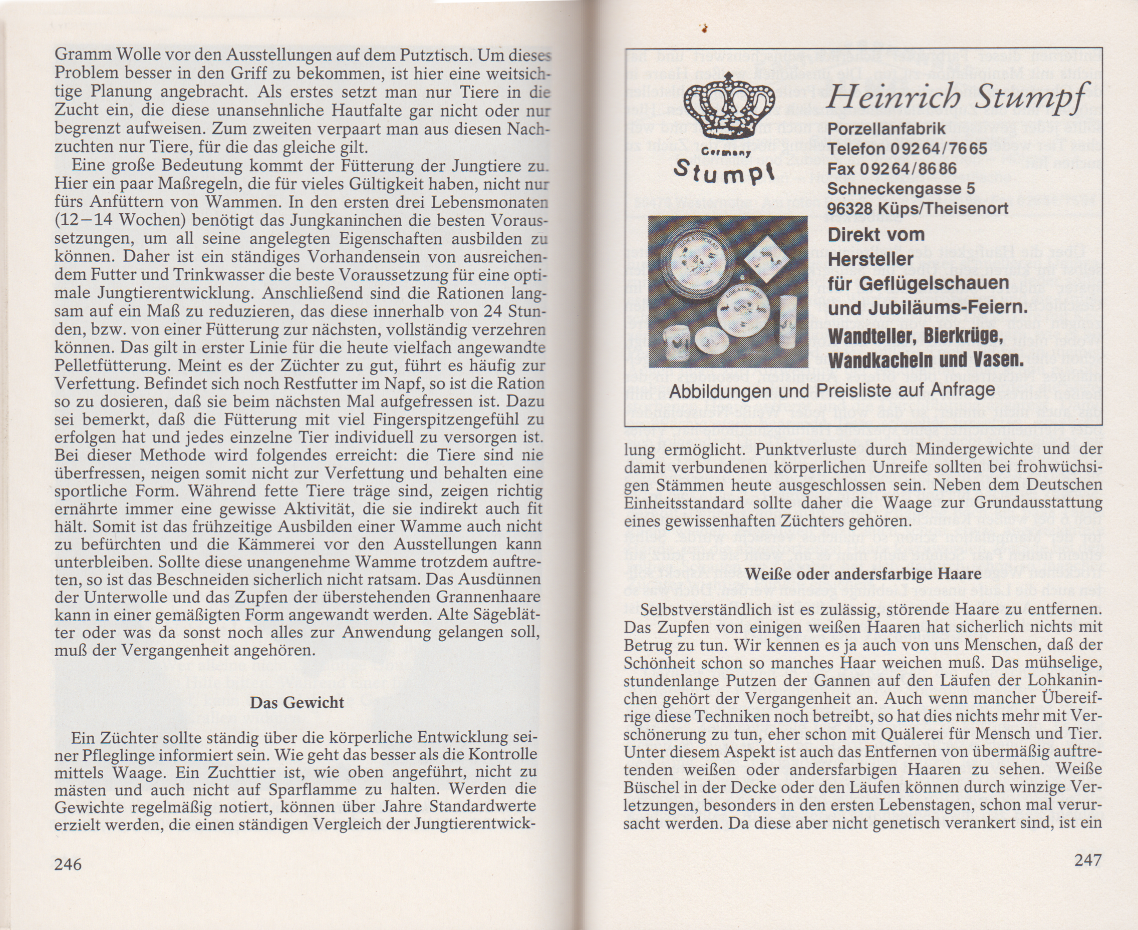 Eine große Bedeutung kommt der Fütterung der Jungtiere zu. Hier ein paar Maßregeln, die für vieles Gültigkeit haben, nicht nur fürs Anfüttern von Wammen. In den ersten drei Lebensmonaten (12-14 Wochen) benötigt das Jungkaninchen die besten Voraussetzungen, um all seine angelegten Eigenschaften ausbilden zu können. Daher ist ein ständiges Vorhandensein von ausreichen- dem Futter und Trinkwasser die beste Voraussetzung für eine opti- male Jungtierentwicklung. Anschließend sind die Rationen lang- sam auf ein Maß zu reduzieren, das diese innerhalb von 24 Stunden, bzw. von einer Fütterung zur nächsten, vollständig verzehren können. Das gilt in erster Linie für die heute vielfach angewandte Pelletfütterung. Meint es der Züchter zu gut, führt es häufig zur Verfettung. Befindet sich noch Restfutter im Napf, so ist die Ration so zu dosieren, dass sie beim nächsten Mal aufgefressen ist. Dazu sei bemerkt, dass die Fütterung mit viel Fingerspitzengefühl zu erfolgen hat und jedes einzelne Tier individuell zu versorgen ist. Bei dieser Methode wird folgendes erreicht: die Tiere sind nie überfressen, neigen somit nicht zur Verfettung und behalten eine sportliche Form. Während fette Tiere träge sind, zeigen richtig ernährte immer eine gewisse Aktivität, die sie indirekt auch fit hält. Somit ist das frühzeitige Ausbilden einer Wamme auch nicht zu befürchten und die Kämmerei vor den Ausstellungen kann unterbleiben. Sollte diese unangenehme Wamme trotzdem auftreten, so ist das Beschneiden sicherlich nicht ratsam. Das Ausdünnen der Unterwolle und das Zupfen der überstehenden Grannenhaare kann in einer gemäßigten Form angewandt werden. Alte Sägeblätter oder was da sonst noch alles zur Anwendung gelangen soll, muss der Vergangenheit angehören.