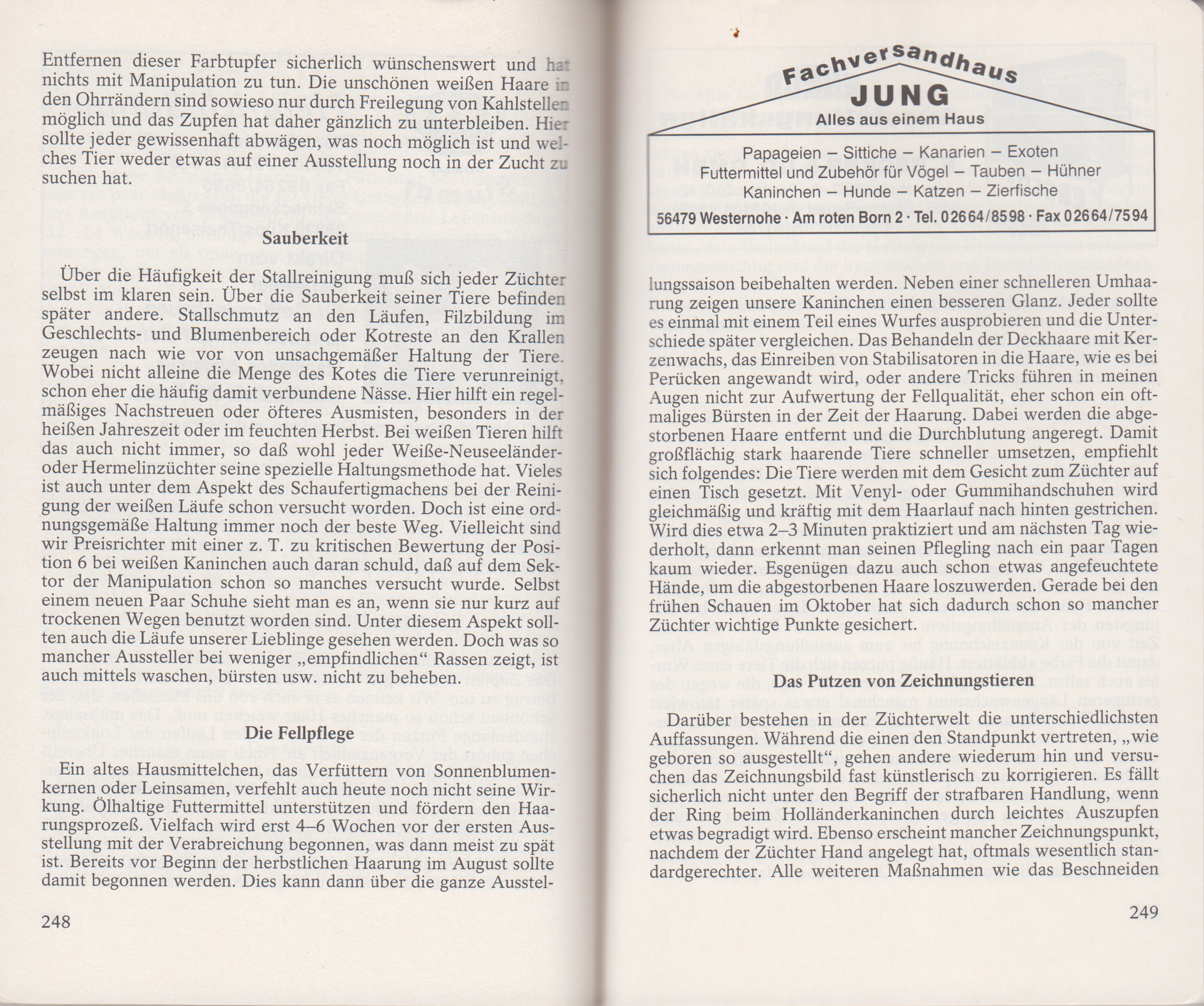 Darüber bestehen in der Züchterwelt die unterschiedlichsten Auffassungen. Während die einen den Standpunkt vertreten „ wie geboren so ausgestellt“, gehen andere wiederum hin und versuchen das Zeichnungsbild fast künstlerisch zu korrigieren. Es fällt sicherlich nicht unter den Begriff der strafbaren Handlung, wenn der Ring beim Holländerkaninchen durch leichtes Auszupfen etwas begradigt wird. Ebenso erscheint mancher Zeichnungspunkt, nachdem der Züchter Hand angelegt hat, oftmals wesentlich standardgerechter. Alle weiteren Maßnahmen wie das Beschneiden oder Färben haben zu unterbleiben. Nicht nur, dass sonst sämtliche Tiere von der Bewertung und der Preisverteilung gar ausgeschlossen werden. Neben einer zu erwartenden Verbandsstrafe bleibt vielfach auf Jahre hinaus ein fader Beigeschmack, wenn die Rede auf den Ertappten kommt.