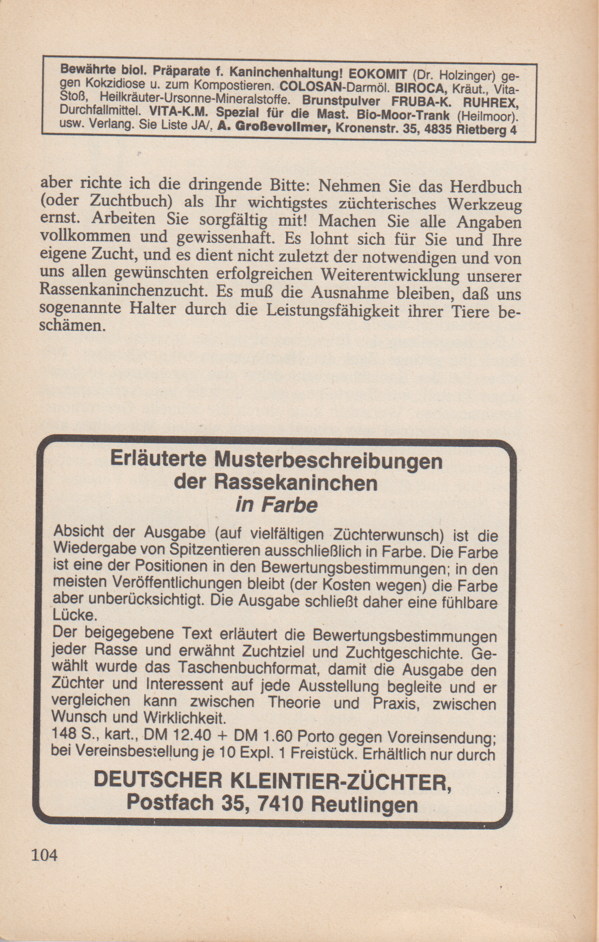 Noch manches ließe sich über den Wert und die vollkommene Führung eines dem Fortschritt dienenden Herdbuches sagen. Nur das Wesentliche konnte ich hier herausheben. An alle Züchter aber richte ich die dringende Bitte: Nehmen Sie das Herdbuch (oder Zuchtbuch) als Ihr wichtigstes züchterisches Werkzeug ernst. Arbeiten Sie sorgfältig mit! Machen Sie alle Angaben vollkommen und gewissenhaft. Es lohnt sich für Sie und Ihre eigene Zucht, und es dient nicht zuletzt der notwendigen und von uns allen gewünschten erfolgreichen Weiterentwicklung unserer Rassenkaninchenzucht. Es muss die Ausnahme bleiben, dass uns sogenannte Halter durch die Leistungsfähigkeit ihrer Tiere beschämen.
