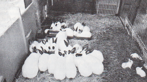 Die Häsinnen-Abteilung des Innenraum-Geheges mit Tieren aller Altersgruppen, seit 2004 nur in der Rasse Kalifornier. Foto: Lothar Thormann, Waldheim/Sa.