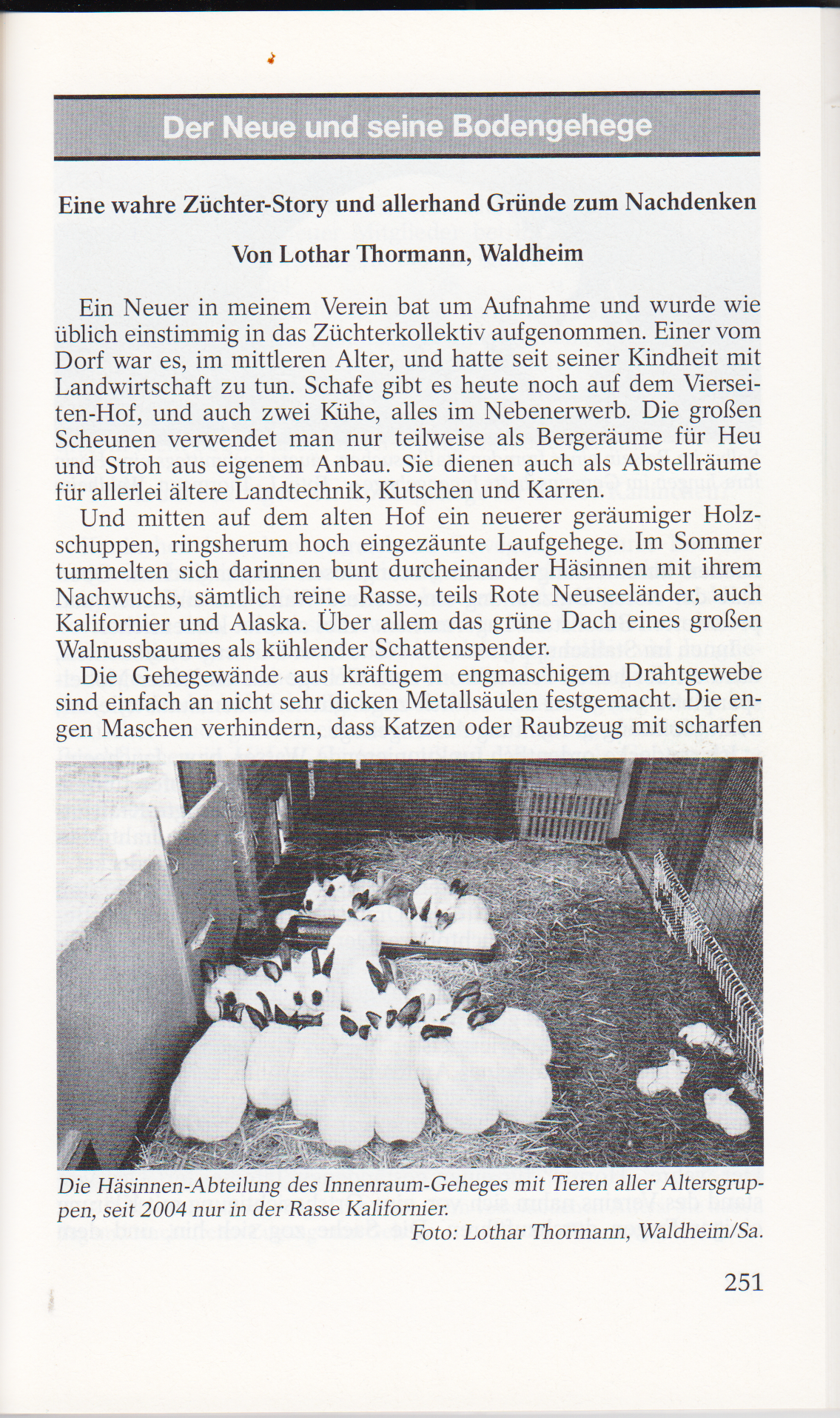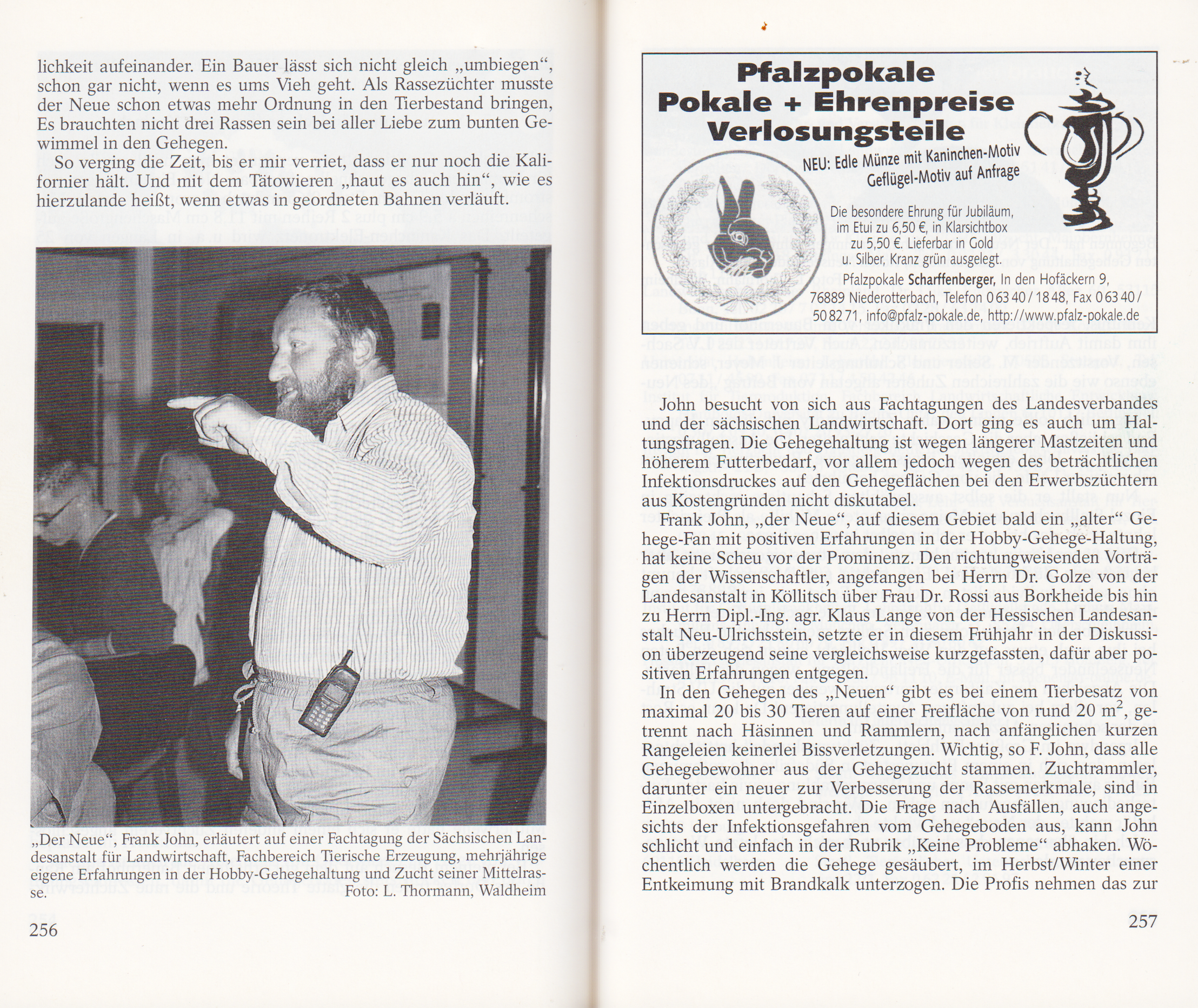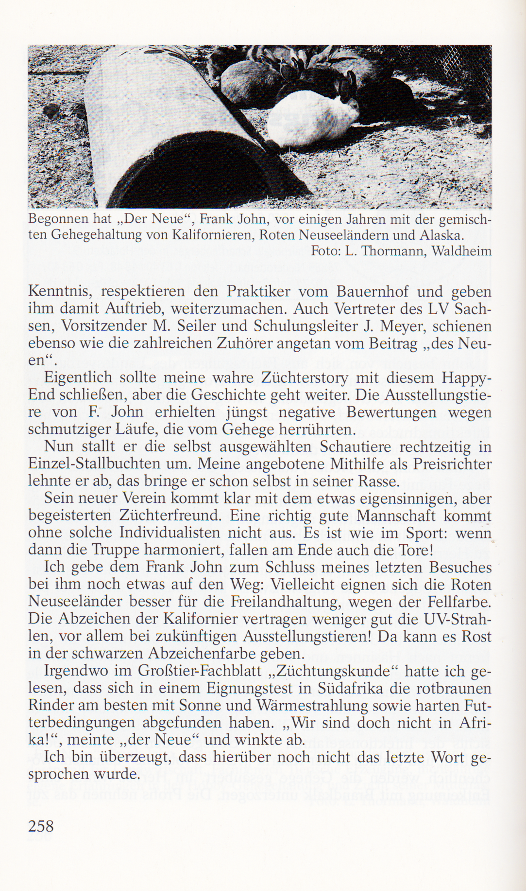 Ich gebe Frank John zum Schluss meines letzten Besuches bei ihm noch etwas auf den Weg: Vielleicht eignen sich die Roten Neuseeländer besser für die Freilandhaltung, wegen der Fellfarbe. Die Abzeichen der Kalifornier vertragen weniger gut die UV-Strahlen, vor allem bei zukünftigen Ausstellungstieren! Da kann es Rost in der schwarzen Abzeichenfarbe geben.